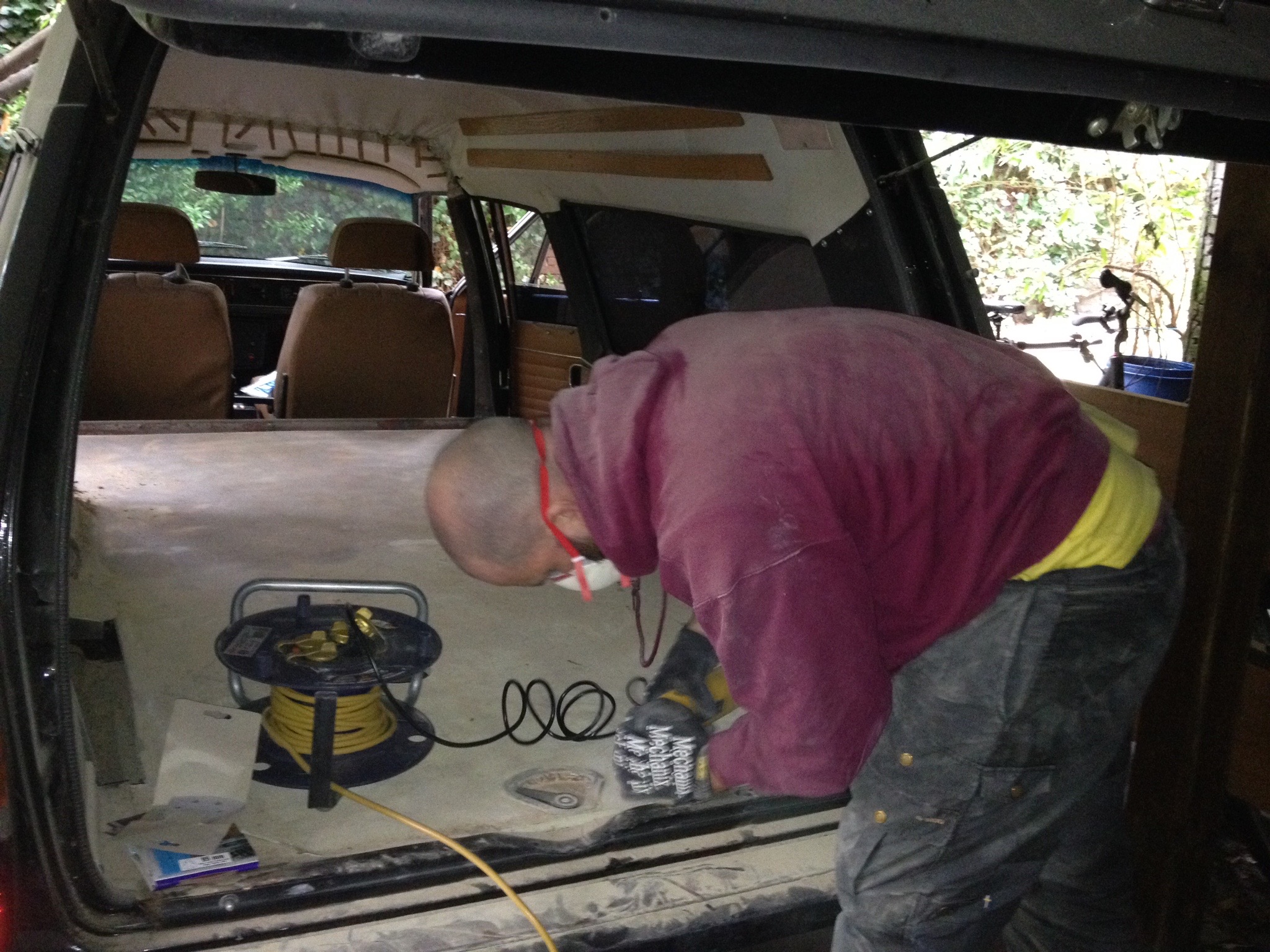 Zum Start standen zweieinhalb Stunden Schleiforgie auf dem Programm. Der alte Linoleumboden war mit Unmengen an Kleber verlegt und hat beim Rausreißen den Großteil seiner Kokosfaserunterschicht im Auto belassen. Die seit vierzig Jahren verbackene Schicht aus einer Lage Kokos, einer Lage Kleber und einer Lage Spachtelmasse zum Ausgleich der Unebenheiten zwischen den einzelnen verlegten Bodenbrettern wollte sich nicht wirklich vom Auto trennen. Wir haben es so gut es ging beigeschliffen, ein paar Unebenheiten verblieben trotzdem. Da später noch ein Teppich verlegt werden soll, dürften die aber kein Problem darstellen.