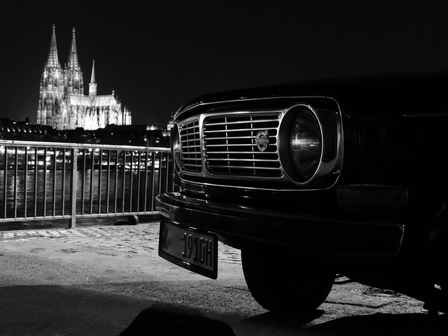 Der Vollmond (oder annähernd Vollmond) aber hat ein tolles „Nachtlicht“ gezaubert, und so haben wir noch schnell ein paar Fotos auf der Deutzer Werft für das Lokalkolorit geschossen. Ein Leichenwagen, der Dom und dazwischen der Rhein.