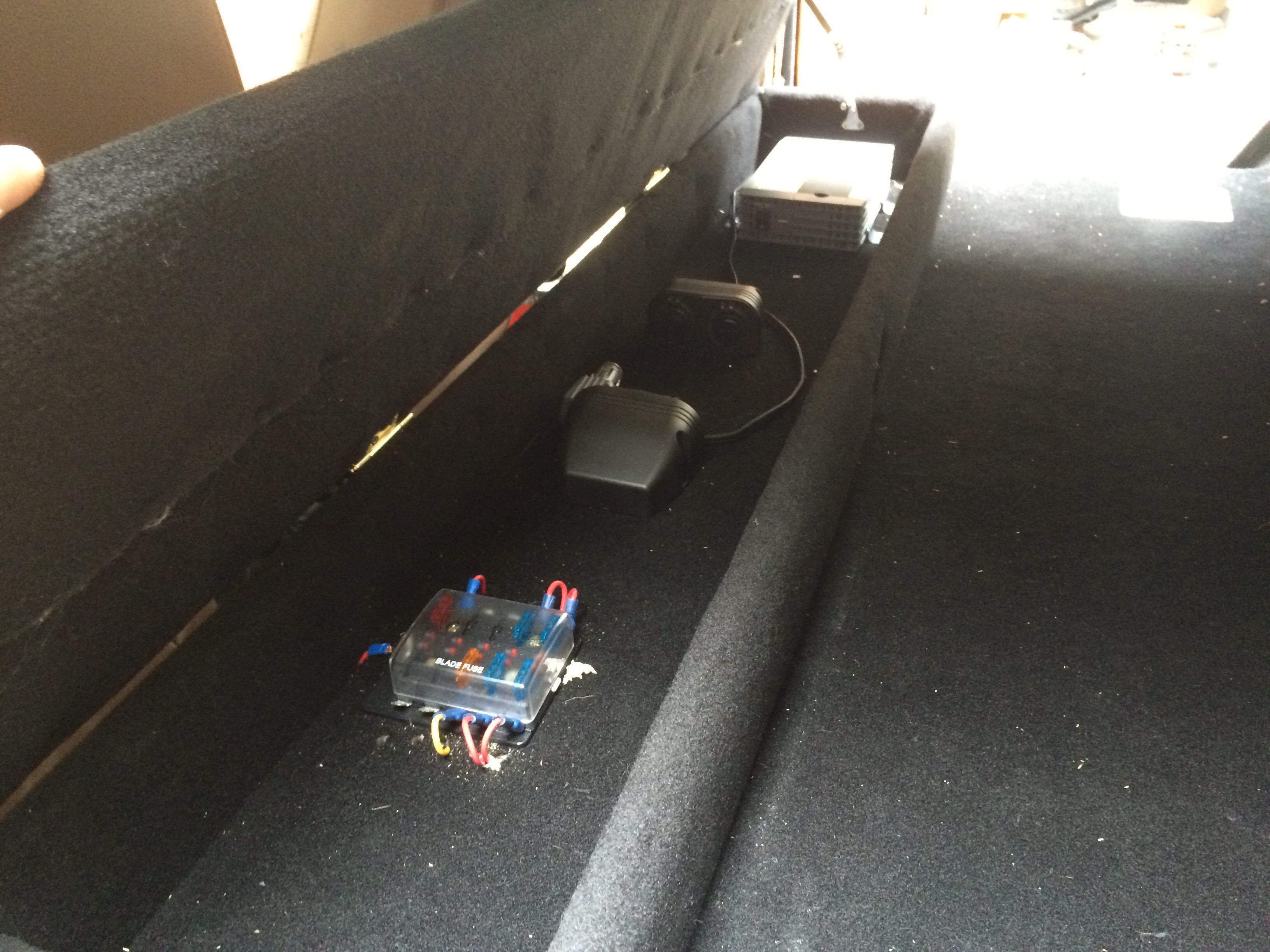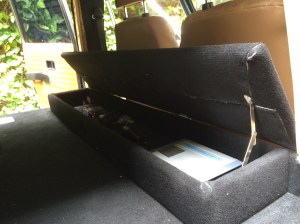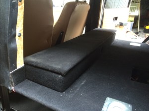 Heute haben wir die auf der Ladefläche verbaute Elektrik (Sicherungshalter, mehrere Steckdosen, Spannungswandler) noch mit einer Kiste verschalt. So ist alles gegen Rumrutschendes in Sicherheit. In der Kiste ist auch genug Platz um ladende Elektrosachen unterzubringen. Erreichbar ist alles über einen klappbaren Deckel mit Arretierung.