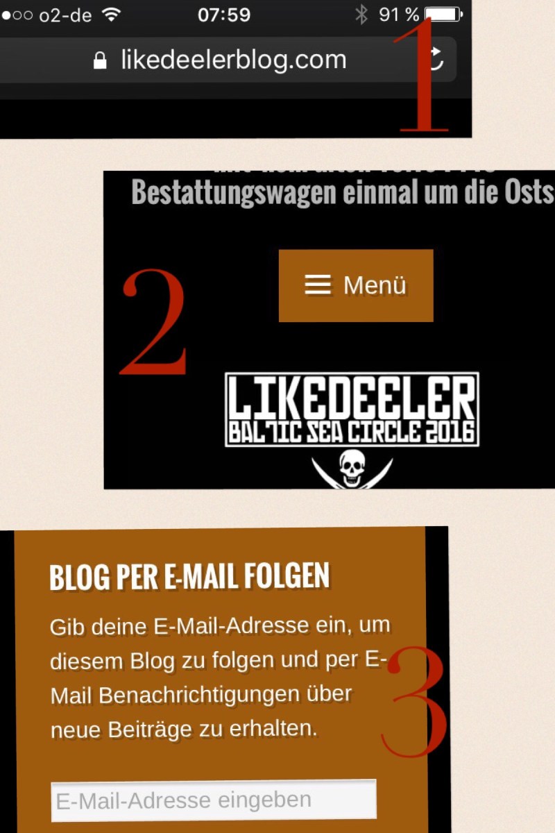 Hier unter www.likedeelerblog.com auf „Menü“ klicken, ganz runterscrollen, dann bei „Blog per Email folgen“ die eigene Emailadresse eintragen und auf „Folgen“ klicken. Supereinfach, superschnell und direkt immer wissen, wo wir uns grade rumtreiben.