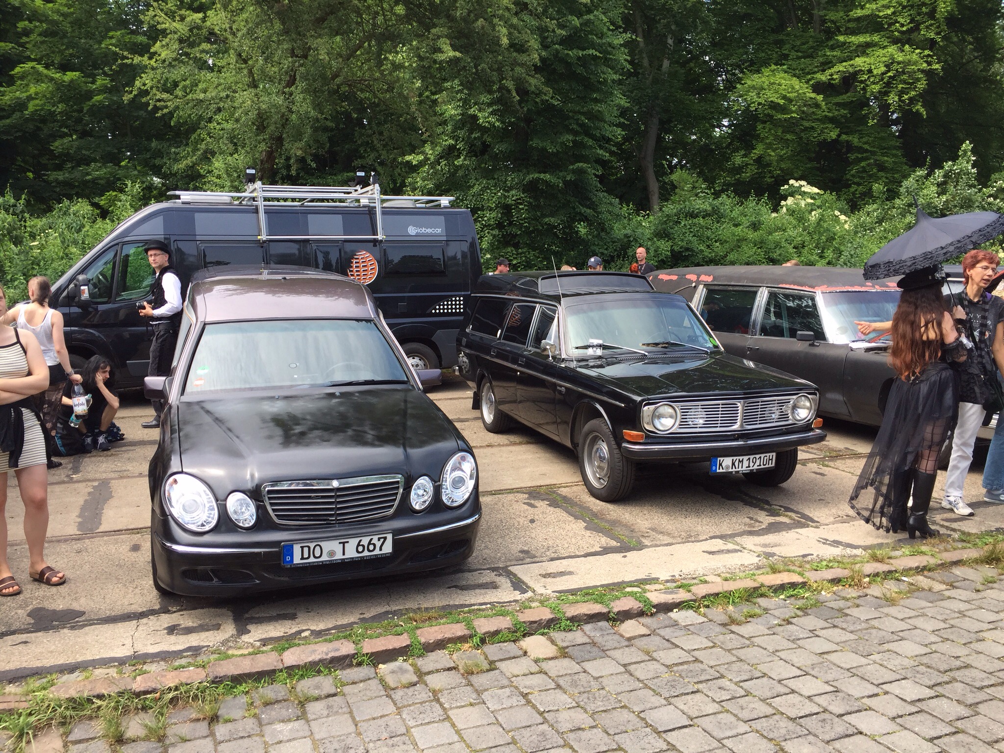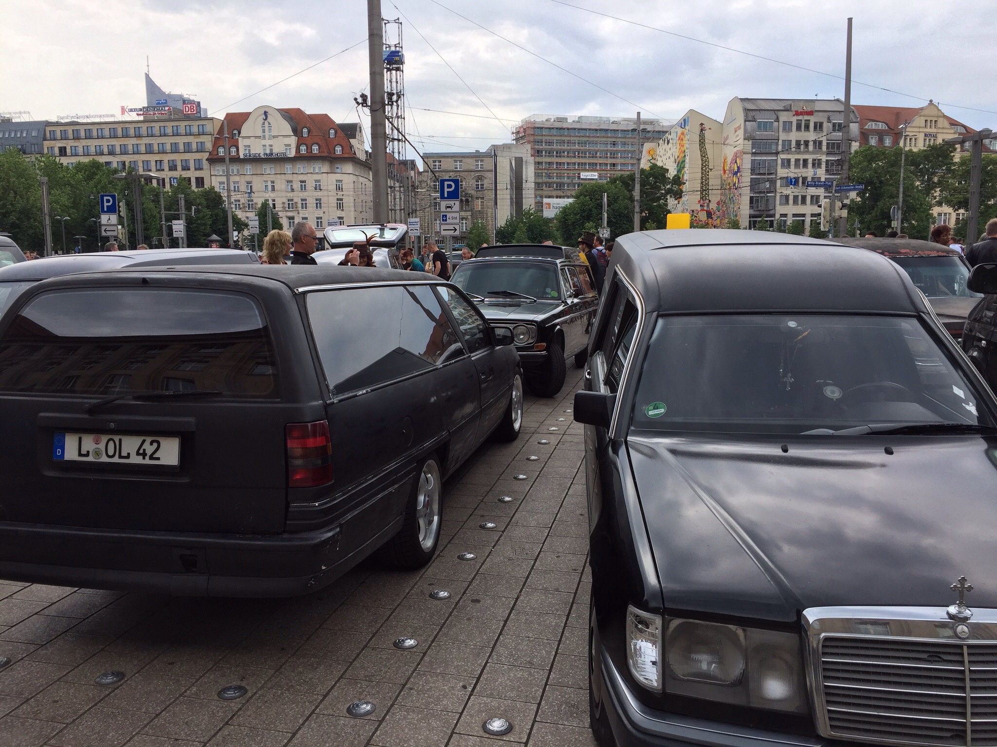 Samstag ging es entspannt Richtung Leipzig. Treffpunkt war der Kurzzeitparkplatz vorm Hauptbahnhof. Dank Navi gar kein Problem (wir fahren ja grade kein Rallye) und stossen wir dort auf etwa zwölf andere Leichenwagen, weitere trudeln langsam ein. Vom /8 mit Pollmann-Aufbau über W123er bis hin zu 190er war die Mercedes-Fraktion relativ stark, es gab aber auch Opel und Volvo-Umbauten und einige amerikanische Exoten. Der Zustand reichte von hochglanzpoliert und schick ausgebaut über alltagsgenutzt bis hin zu wirklich heftigem Rat-Rod-Look. Gesäumt wurde der Sammelplatz von etlichen neugierigen Menschen, immer wieder huschten irritierte Reisende über den Parkplatz. Ein Kamerateam begleitete einen Leichenwagen für eine Doku über das WGT und sammelte Atmo-Shots. Die Doku von artour gibt es beim MDR hier in der Mediathek, ca. bei Minute 02:09 posen wir Likedeeler. Der Arbeitsauftrag war „bitte böse gucken“, geworden ist es eher lässiges Kofferraum-Anlehnen mit vor Sonne zusammen gekniffenen Augen. Wenn es denn der Doku dient, warum nicht.