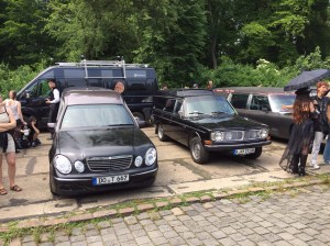 Nachteil einer Konvoifahrt im Sommer: es wird heiß. Wir hatten Glück, sahen uns jedoch in den Kühlungs-Überlegungen vom Vortag bestätigt. Ein Benz mit Bestattungsanhänger kochte bei Erreichen des Südfriedhofs über und blieb in einer spektakulären weißen Rauchwolke stehen. Zum Glück direkt auf dem Parkplatz, also im Prinzip genau auf der Ziellinie. Im Nachhinein stellte sich raus, dass es sich um nichts Ernstes handelte so daß schwerwiegende Reparaturen nicht von Nöten ware, es war simples Überkochen.