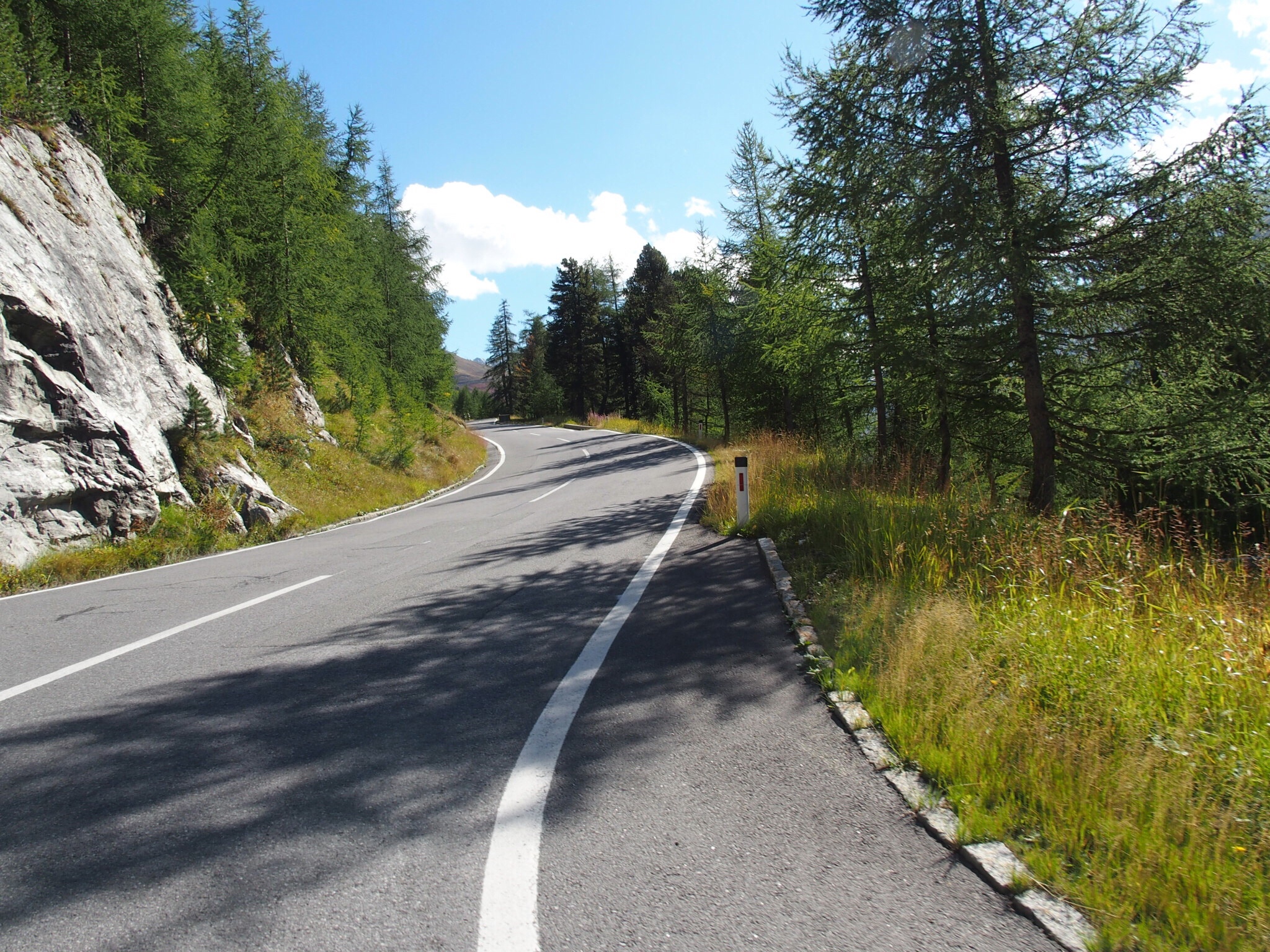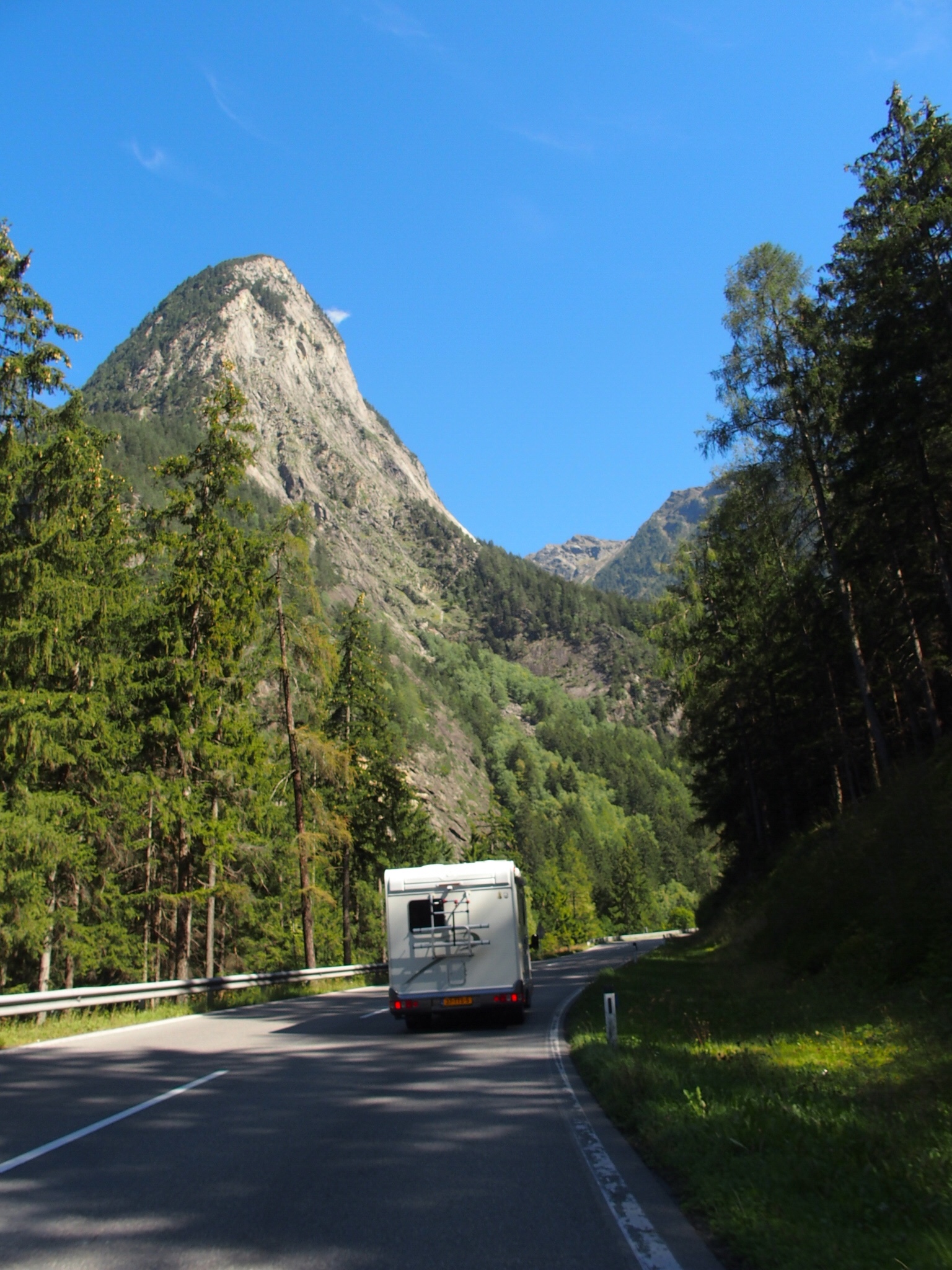 Kurz vorm Stelvio tauschen wir nochmal, den Pass möchte ich gerne fahren. Während das Timmelsjoch breite, gut ausgebaute und abgesicherte Strassen hat ist der Stelvio deutlicher rougher und ursprünglicher, teilweise nur anderthalb Autos breit, viel kurviger und unübersichtlicher. Deutlich engere Haarnadelkurven. Und richtig raube Berglandschaft ringsum. Felsen in denen man riesige Verwerfungen der Gesteinsschichten sehen kann, tolle Bergspitzen die sich in den Himmel recken. Unglaublich beeindruckend, unglaublich zufriedenstellend zu fahren. Während der Abfahrt machen wir sicherheitshalber einen Bremsabkühlungsstop, und währenddessen sinkt die Sonne in Rekordtempo. Bevor wir den Fuss erreicht haben ist es dunkel. Der letzte Teil vor Bormio führt durch eine Vielzahl beleuchteter Lawinentunnel um schließlich in den Ort zu münden. Ab Bormio fahren wir Richtung Süden, in Sondalo soll es einen Campingplatz geben, der einzige in der Gegend.