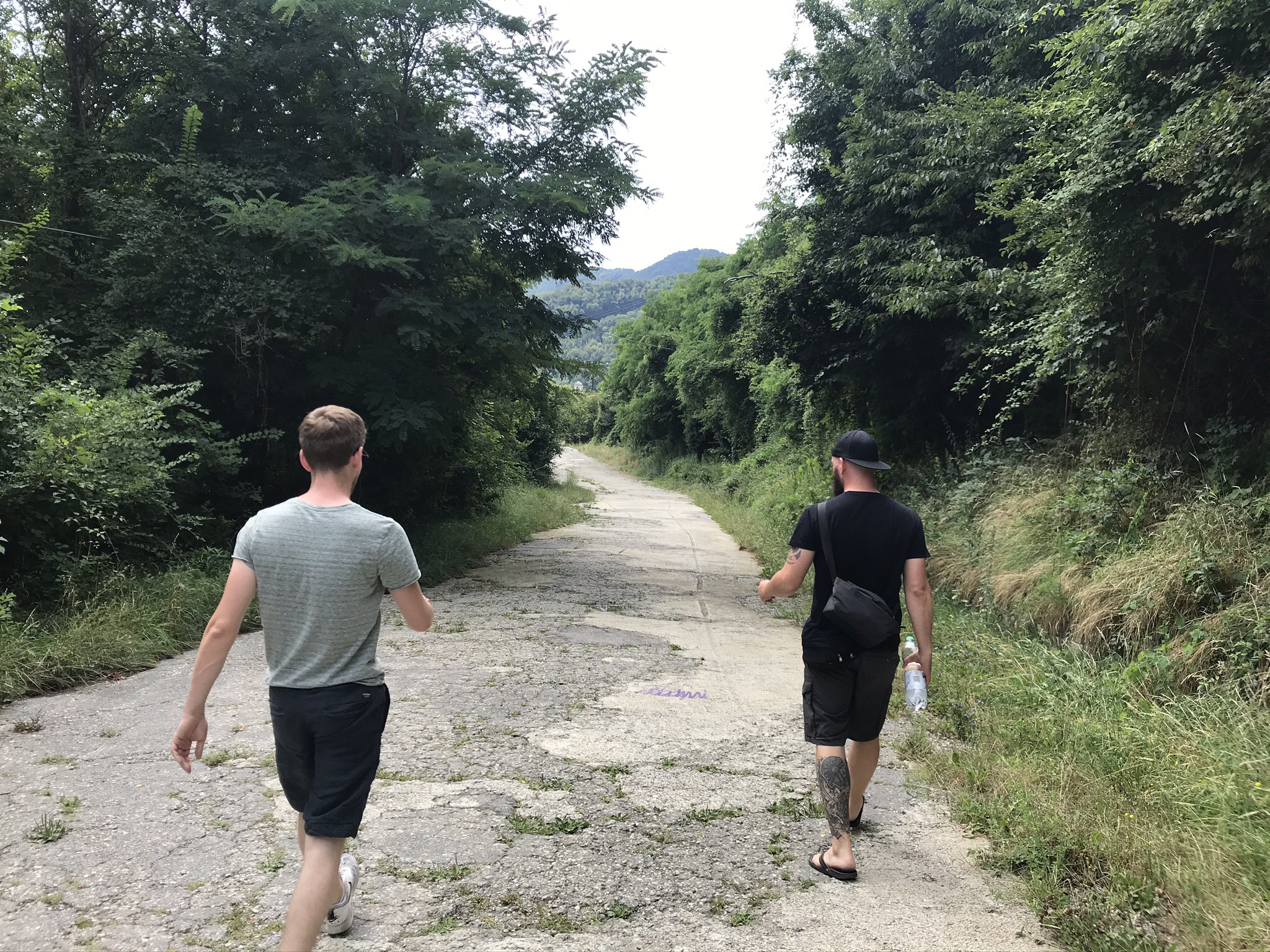 Irgendwann verlieren wir den LKW aus den Augen, wir folgen einer Abzweigung hoch in den Wald. Die Strasse wird deutlich schlechter, riesige Schlaglöcher und Asphaltflickenteppiche reduzieren unser Tempo deutlich. Auch die Natur wächst immer mehr zur Strassenmitte hin. Nach einigen Kehren stehen wir vor einer verschlossenen Schranke. Wir parken am Rand, nehmen etwas zu Trinken mit und machen uns auf den Weg an der Schranke vorbei. Katrin pflegt ihre eigene Challenge alles auf dieser Tour in Flipflops zu machen (auch den steilen Aufstieg am Gardasee hat sie in Flipflops gemacht). Die Strasse macht noch ein paar Kehren, erstaunlicherweise ist der Asphalt hier besser als den Berg hinauf.