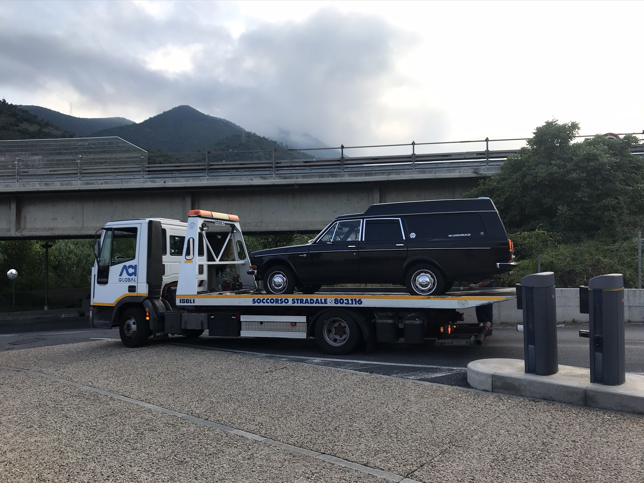 Also im E30 hinterher. Wo er den Volvo hinbringen wird wissen wir nicht. Anruf beim ADAC, die konnten das auch nicht so genau sagen, wir dürften aber ein Taxi zum Hotel nehmen. Welchem? Nicht ihr Problem, da wir keine eigene Buchung haben bekommen wir vom ADAC kein Hotel. Wo der Wagen hinkommt? Keine Ahnung, die Abschlepper haben ja meine Nummer, die melden sich schon. Also weiter dem Abschlepper hinterher, mit mulmigen Gefühl da der Volvo auf der Ladefläche hin und her hopst und die Zurrgurte nach kurzer Zeit bereit lose herumhängen. Das Ziel: eine „Verwahrstelle“. So nennt man es in Italien wohl. In unseren Augen ist das ein Schrottplatz. Wieder Anruf beim ADAC, Status ist, wir werden keinen Meter weiter geschleppt und am Freitag kann sich auch niemand das Auto angucken weil am Samstag Feiertag ist. Verstehe einer diesen Zusammenhang. Also lassen wir mit mulmigen Gefühl im Bauch den Volvo inklusive Schlüssel dort.