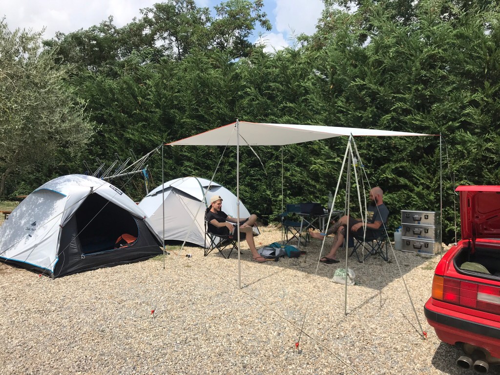 Auf dem Campingplatz bauen wir Zelte und Tarp auf, prügeln die Erdnägel in den sehr festen Boden und richten uns für die nächsten Tage ein. Der beste Campingspot ist das hier vorne in der Einfahrt nicht, der Platz hat deutlich schönere Parzellen – die sind aber leider alle voll. So können wir Buch darüber führen wer wie oft kommt und geht, jedes neue Wohnmobil beim parken bis zur Parzellenzuweisung von unserem Campingtisch aus begutachten und die pädagogischen Besonderheiten der Kinderbespaßung an und im Pool bewerten. Trotzdem findet sich so etwas wie Entspannung, wir lesen, quatschen und gucken Löcher in die Luft. Außerdem eruieren wir die Möglichkeiten der nächsten Tage und planen zumindest für Samstag und Sonntag Ausflüge zu angedachten Spots. Wir wollen uns den Urlaub jetzt nicht versauen lassen und das beste draus machen.