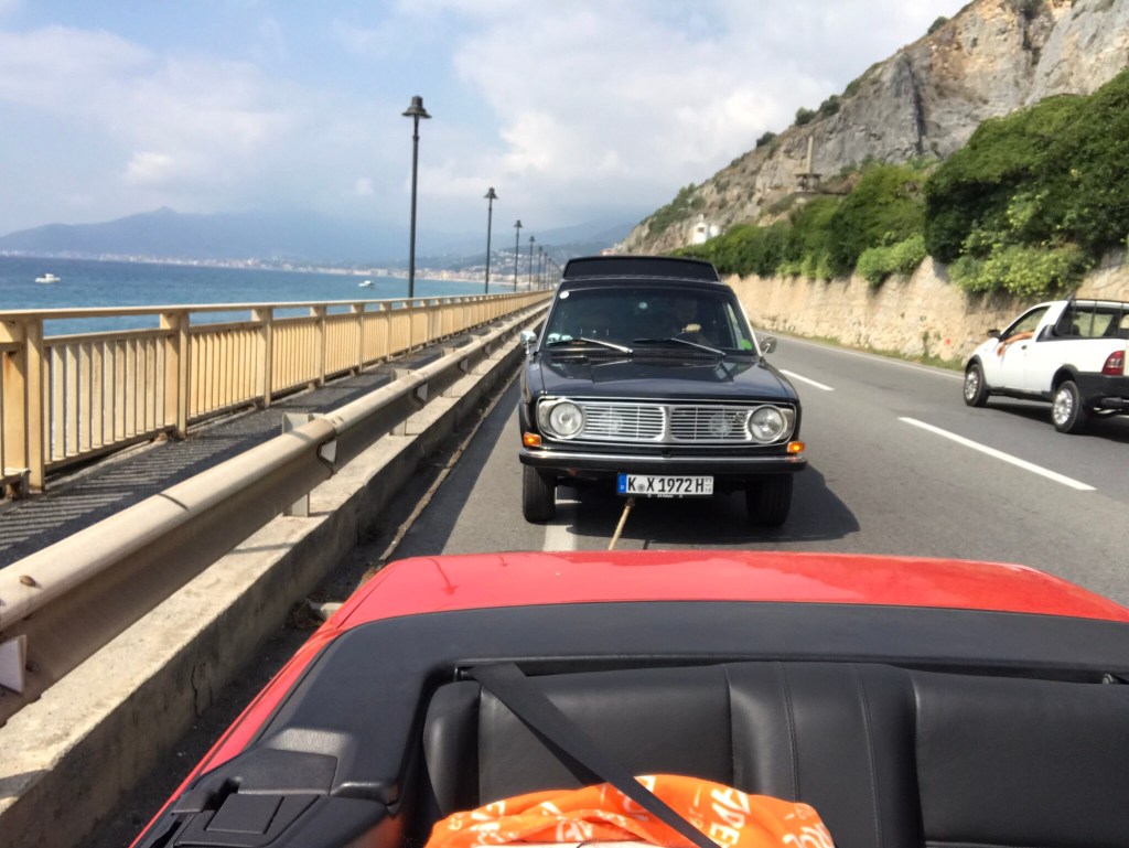 Wir bekommen in unserem B&B ein traumhaftes Frühstück mit frischem Obst, Joguhrt, drei verschiedenen Kuchen, Croissants, Brötchen, Marmelade und einem Kaffee der Tote weckt. Während des Frühstücks, ca. 08:30 Uhr checken wir das erste Mal den GPS-Tracker vom Volvo – der steht immer noch auf dem Schrottplatz. Anruf bei dem Abschlepper – keine Reaktion (zur Erinnerung: der war per SMS informiert. Der wusste, das wir Zeitdruck haben.) Anruf beim ADAC – der Auftrag sei raus. Wir entscheiden uns dazu, das Frühstück in Ruhe zu genießen und dann erstmal Richtung neuer Werkstatt zu fahren um mit denen zu sprechen. Und ein bisschen Hoffnung haben wir, dass der Volvo bis dahin auch dort ist. Abfahrt um ca. 09:30 vom B&B, der Volvo ist immer noch auf dem Schrottplatz. Anruf bei dem Abschlepper – keine Reaktion. Anruf beim ADAC – ja, das würde irgendwann gemacht, man würde noch einmal eine Mail an den italienischen Partner schreiben. Der Weg führt in Serpentinen durch nebelverhangene Berge runter ans Meer, es ist angenehm frisch und die Luft wunderbar. Die Vorteile eines Cabrios liegen auf der Hand. Auch jetzt werden für einige Momente die Sorgen weggeblasen. Während der Fahrt kurze Google-Recherche zu dem Abschlepper/Werkstatt-Leuten: ein paar positive Bewertungen von anscheinend Stammkund_innen, ein Haufen negative Bewertungen von ortsfremden Menschen, die von denen bei Pannen abgeschleppt wurden. Die Geschichten alle ähnlich. Wir haben ein ganz schlechtes Gefühl.