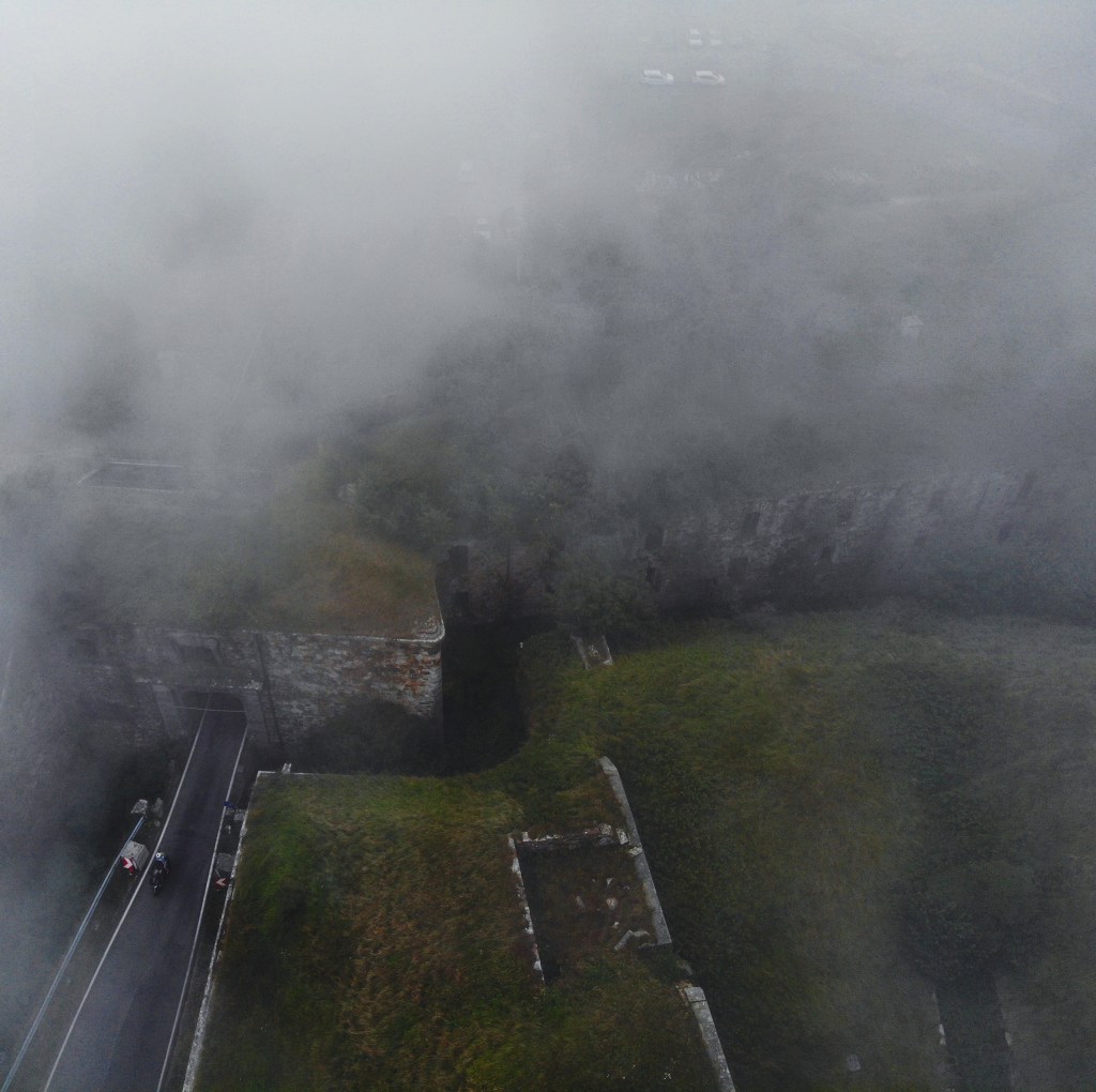 Wir durchstreifen die Baracken und machen Fotos, müssen dabei aber vorsichtig sein, durch die Karstlandschaft gibt es einige Absackungen und Löcher die auch teilweise unter dem dichten Laub auf dem Boden verbergen. Am Fort selber trauen wir uns nicht, den militärischen Sperrbereich zu betreten. Im nahegelegenen Gasthaus ist dank Feiertag auch viel los, unbeobachtet sind wir also nicht. Wir starten die Drohne und versuchen durch die über den Berg ziehenden Wolken ein paar gute Fotos zu bekommen.