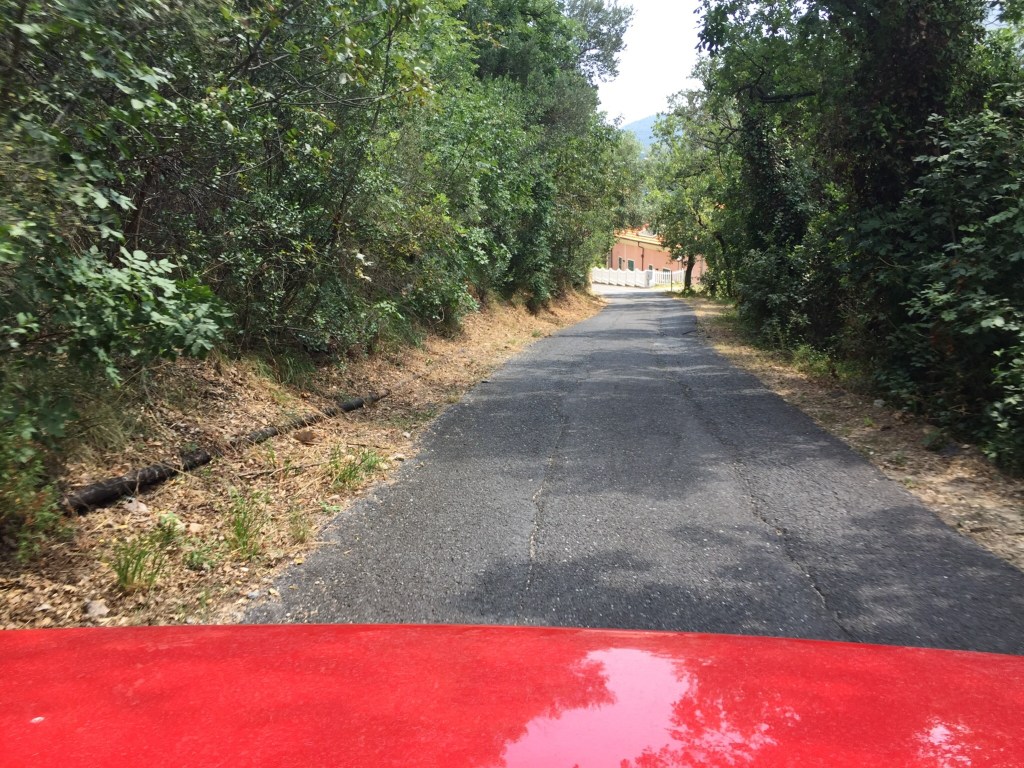 Für den Rückweg nehmen wir den langen Weg: wir folgen von Balestrino aus der SP44 bis Castelvecchiodi Rocca Barbara, biegen auf die SP52 bis Villagio Rocca Barbena und folgen einer nicht bezeichneten Strasse nach Osten in die Wälder und Berge. Leider endet diese für uns, abrupt hört der Asphalt auf und der dahinter liegende Schotterweg ist bei allem Wagemut mit dem E30 nicht machbar. Also Umkehr, zurück auf die SP52 Richtung Norden bis Bardineto und dort auf die SP1/60. Diese schlängelt sich mit langen graden und schnellen Kehren durch Wälder am Monte Carmo di Loano entlang Richtung Toirano. Und plötzlich, in einer Kehre bei Carpe, entdecken wir einen einsamen LostPlace. Ein Restaurant/Hotel/Superschurken-Villa mit Blick ins Tal. Und einem riesigem Haufen ausgeschlachteter Leihfahrräder im Pool und in mehreren Zimmern. Wir streifen hier durch und freuen uns, doch noch etwas entdecken zu können.