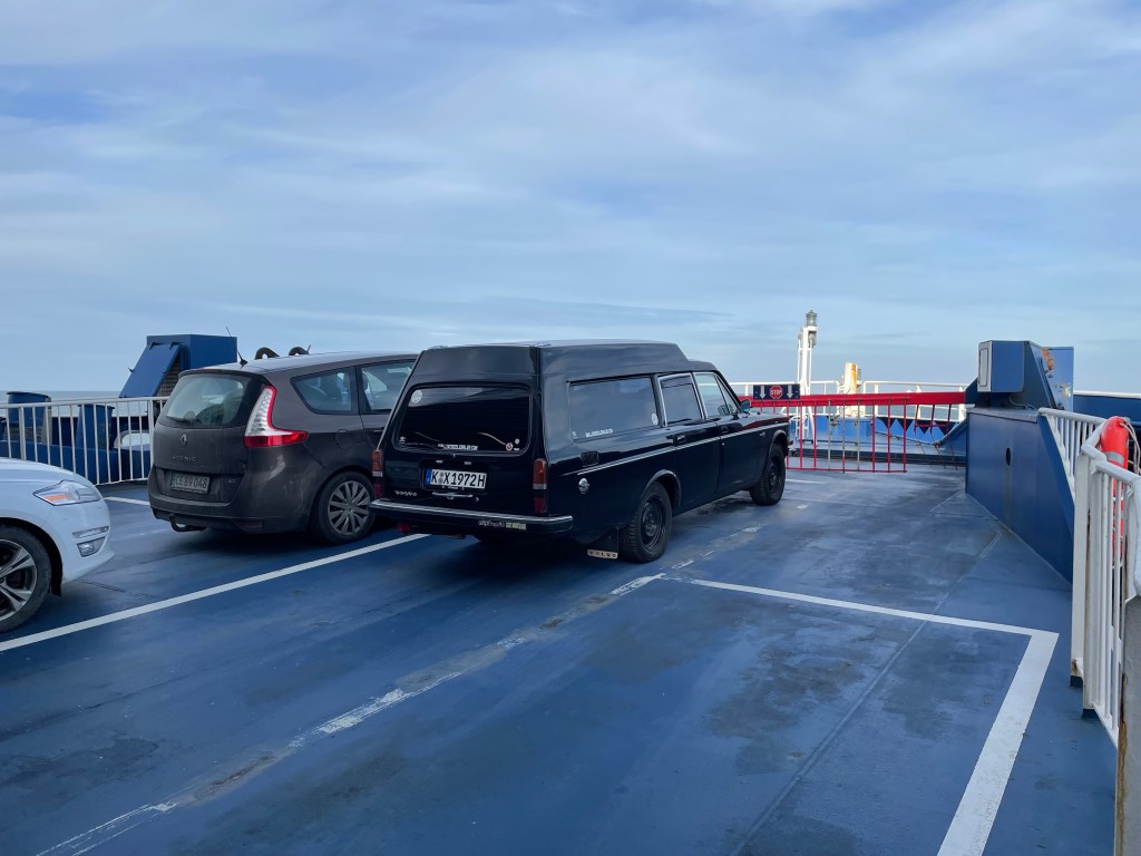 Für die Fähre haben wir ein Flex-Ticket gebucht, Vorteil ist, man muß keine bestimmte Fähre nehmen, kann also jederzeit am Hafen aufschlagen, darf in die VIP-Spur und somit als erster an Bord und als erster wieder runter und bekommt dort auch noch einen Kaffee. Und wir stehen wirklich vorne, absolute Pole Position. Über die Fährfahrt gibt es nicht viel zu erzählen, ruhige Ostsee, ein „geht so“ Kaffee und schon sind wir wieder weg.
