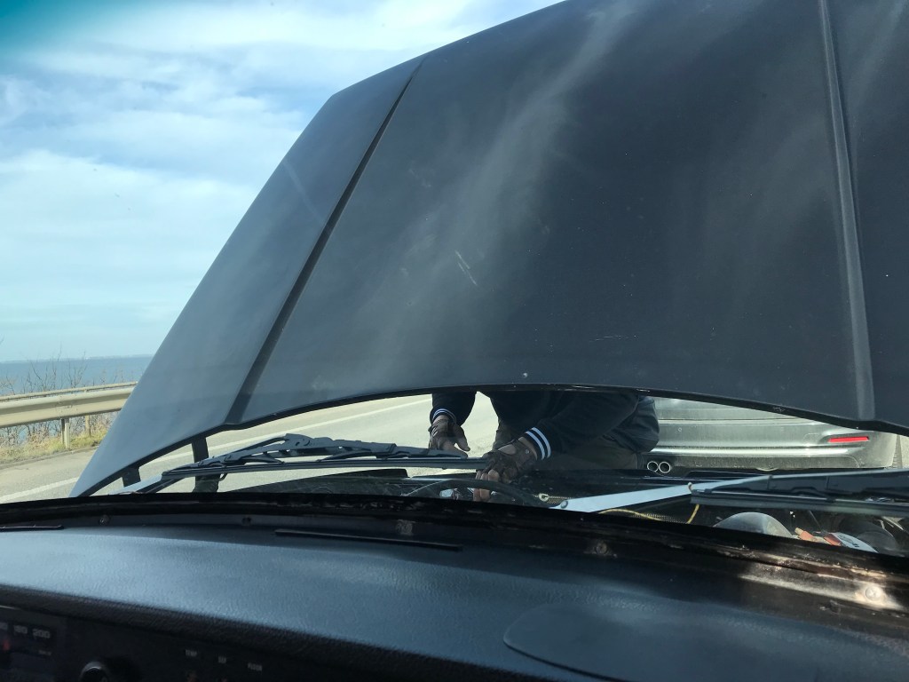 Hinter Hamburg fahren wir auf die Autobahn Richtung Fehmarn, ab Puttgarden geht die Fähre Rödby/Dänemark. Auf dem Weg dorthin überholen uns diverse Rallyeautos, der Carbage Run, eine niederländische Fun-Rallye mit starkem Schwerpunkt auf Fun hat auch eine Winter Edition die nach Skandinavien geht. Und offensichtlich ist dieses Wochenende Start. Auf der Brücke nach Fehmarn ist eine Baustelle (gibt es eigentlich relevante Brücken in Deutschland auf denen keine Baustelle ist?) und dadurch kann ein Teilstück nur einspurig befahren werden. Also stehen wir im Stau. Und während draussen knapp über null Grad sind steigt die Motortemperaturanzeige kontinuierlich. Eigentlich haben wir für genau diesen Fall einen Thermostatschalter verbaut der zwei blasende E-Lüfter vorm Kühler schaltet. Und eigentlich hat der bisher – also die seit wir ihn für die 20Nations Rallye eingebaut haben – immer klaglos seinen Dienst getan. Aber irgendwie ist ja grade der Wurm in den Kleinteilen. Aus irgendeinem Grund schaltet er nur unter 35 Grad, das ist natürlich Quatsch. Den Stau meistern wir dann ohne große Reparatur, auch im Wartebereich der Fähre machen wir keinen Aufriss. Wir sind auch relativ stressfrei: das passende Ersatzteil haben wir dabei, kann also jederzeit getauscht werden und so lange ein bisschen Wind durch den Kühler geht brauchen wir die Lüfter nicht.