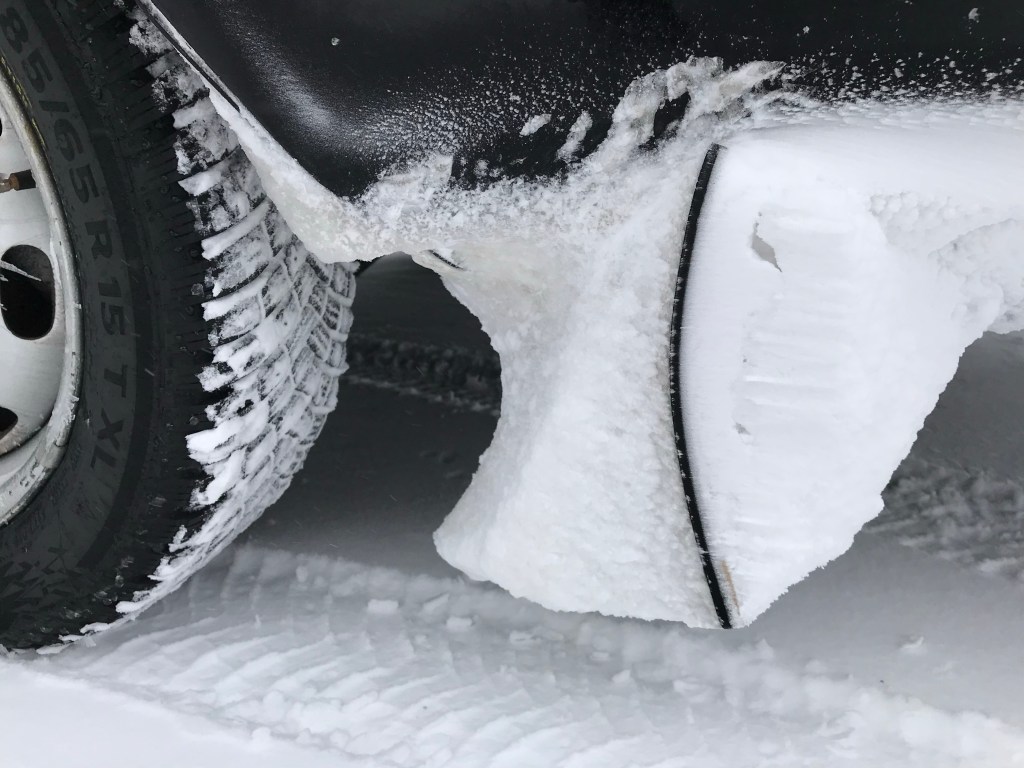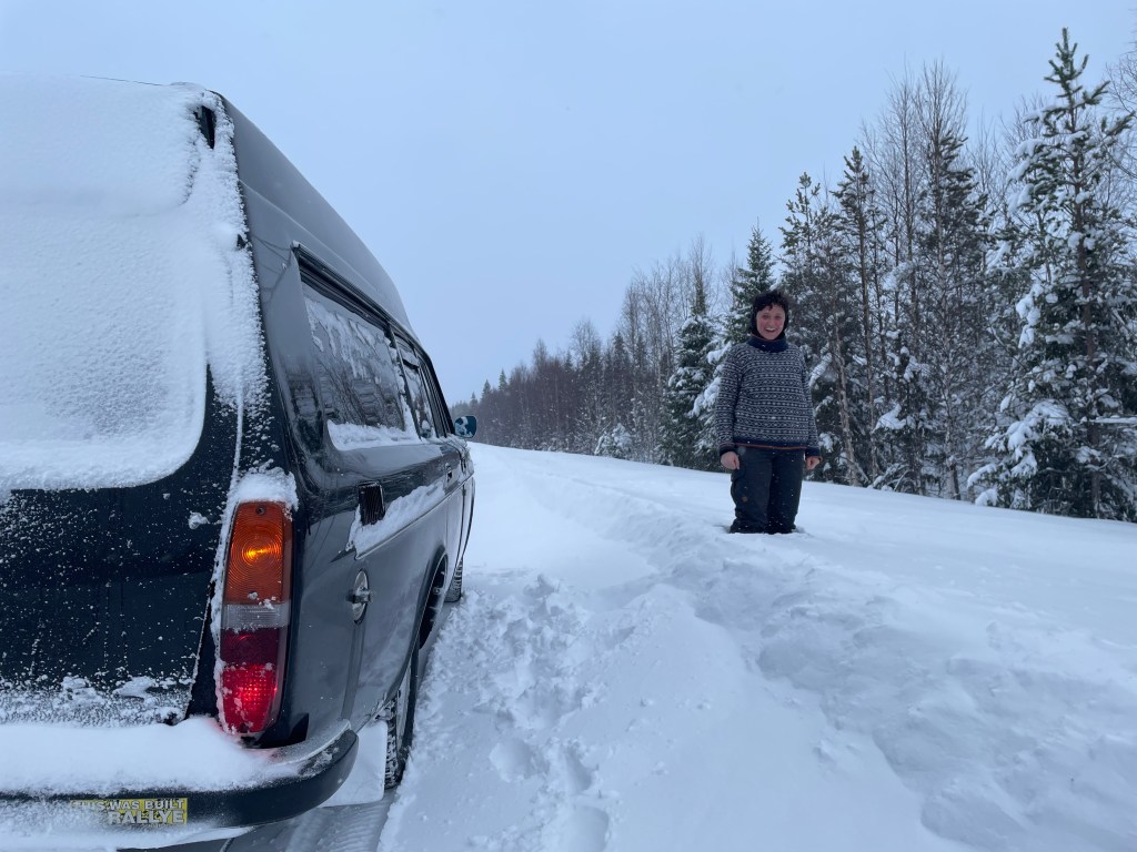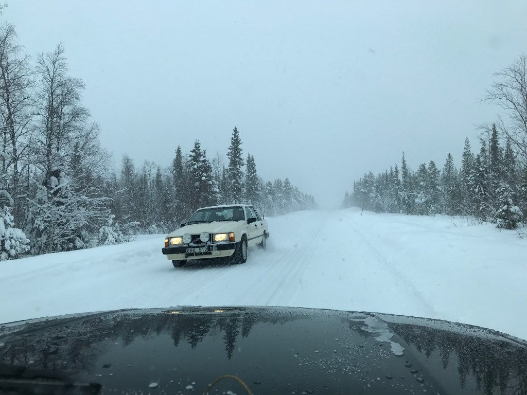 Kaum auf der 99 gibt es ein heftiges „Klonk“ unter dem Auto. Anschließend keine Besonderheiten was Geräusche oder Fahrverhalten angeht, trotzdem geht uns die Düse. Wir wenden zwischen den Schneemauern links und rechts der Straße und fahren den kompletten Weg wieder zurück bis zur Abzweigung. Denn natürlich haben wir uns weder den Tageskilometerstand noch die Umgebung (lol. Weiß. Mit Bäumen. 2/3 Nadel, 1/3 Laub. Irgendwo dahinten Fluss. Denn so sieht es im Prinzip die gesamte Strecke über aus) gemerkt. Auf der Straße sehen wir nichts, die Abzweigung liegt in dem kleinen Ort Aareavaara, dort halten wir in einer freigeräumten Einfahrt und checken Fahrwerk, Antrieb, Auspuff und Unterboden. Sieht alles so aus wie es aussehen soll, plus Eis. Und das wird es am Ende gewesen sein: Eis. Das wahrscheinlich gegen unseren Unterfahrschutz geknallt ist. Der macht nämlich einen ganz ähnlichen Sound wenn man dagegen schlägt. An den Autos sammelt sich hier während der Fahrt überall Schnee. Im Heckbereich, in den Radkästen, hinter den Stoßstangen. Überall. Durch Fahrtwind wird der komprimiert und pappt zusammen, nur eine Frage der Zeit bis das ein schöner Klumpen Eis ist. Und bei der nächsten Bodenwelle verabschiedet der sich dann. Die Straße ist hier voll damit, bisher waren die eigentlich ganz gut zu sehen, gab es noch genügend andere Kontraste. Heute versinkt der ganze Tag aber in endlosem Weiß. Und es ist kaum zu erkennen, wie die Fahrbahnoberfläche aussieht. Oder ob da was liegt. Das bedeutet, dass absolut konzentriert gefahren werden muss, griffiger Belag wechselt schlagartig mit kompletter Gripfreiheit. Hinzu kommen die starke Windböen, die uns mehr als einmal zur Seite drücken – durch rutschigen Untergrund sogar verstärkt.