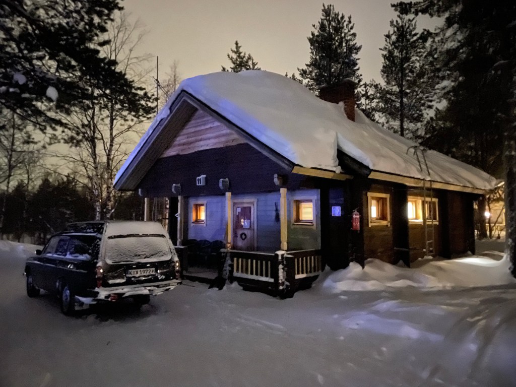 Wir passieren die Stadtgrenze von Hetta und nehmen direkt die erste Tankstelle. Naja. Die einzigste Tankstelle ist es auch. Wir versuchen, den Wagen abends immer mit einem vollen Tank abzustellen, um so die Kondenswasserbildung im Tank zu minimieren. Durch die unterschiedlichen Temperaturen im Auto, im Tank und außen schlägt sich an der Innenseite nicht gefüllter Tanks schnell Kondenswasser nieder. Und Kondesnwasser ist für einen Stahltank eher ungünstig und Wasser im Sprit freut den Vergaser auch nicht. Unmittelbar hinter der Tanke geht es runter zu unserem Schlafplatz für heute Nacht, den Ounasloma Luxury Cottages. Per Zufall am Abend zuvor bei Booking gefunden und eigentlich nur gebucht weil a) auf der Strecke, b) nicht zu teuer und c) Blockhaus mit Sauna. Als wir die Abfahrt von der Straße runterfahren haben wir erstmal ein komisches Bauchgefühl: der Name will nicht so recht zur Rezeption passen, diese hat optisch den Charakter eines Stundenhotels. Blinkendes „Open“-Schild inklusive. Dem Schild widerspricht der nicht geräumte Weg zur Tür. Und dass diese verschlossen ist. Im daneben liegenden Wohnhaus ist auch niemand. Und wir haben per Vorkasse bezahlen müssen.