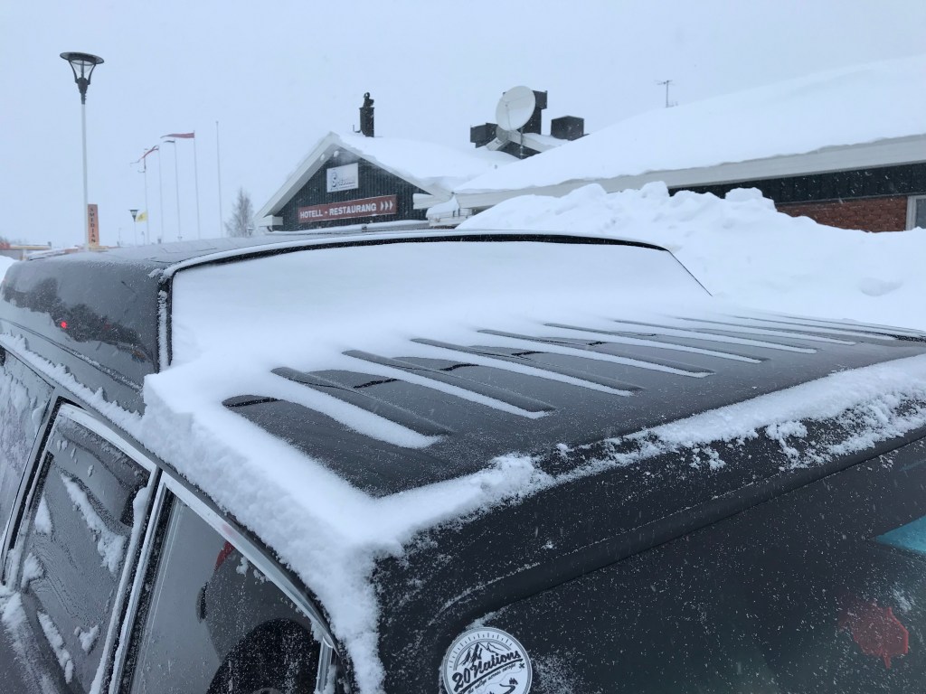 Mit diesem Wissen frühstücken wir erstmal, das Buffet ist überschaubar, einfach aber lecker. Bis auf den Kaffee, das kriegen die schwedischen Hotels offenbar nicht so gut hin. Das sehen wir nach, denn auch hier, in einem nicht ganz up to date wirkenden Truckerhotel bekommt man glutenfreies Brot. Frage an die Hotels in Deutschland: was ist so schwer daran, Essen für verbreitete Nahrungsmittelunverträglichkeiten vorzuhalten? Wir packen in Ruhe unser vorgewärmtes Auto, Matthias hat diesmal daran gedacht, den Innenraumheizlüfter UND den Motorvorwärmer einzuschalten. Bei -6 Grad Außentemperatur und einer Laufzeit von gut zwei Stunden ist der Motorblock gut handwarm, verschleißfreies Anspringen also kein Problem. Tatsächlich hatten wir bisher bei allen Temperaturen bis zu -10 Grad eigentlich kein Problem mit dem Anspringen. Gezogener Choke, ein, zwei Starterumdrehungen und der B20A läuft. Auch kann der Choke wirklich sehr schnell wieder reingeschoben werden. Und dank Leichtlauföl extra für kalte Temperaturen sollte auch sehr schnell ausreichend Schmierung dagewesen sein. Aber trotzdem. Einen angewärmten Motor starten ist immer besser. Das Auto vom Schnee befreien müssen wir übrigens nicht, der Wagen steht so günstig im Wind, dass sich der feinpulvrige Schnee kaum ablagern kann.