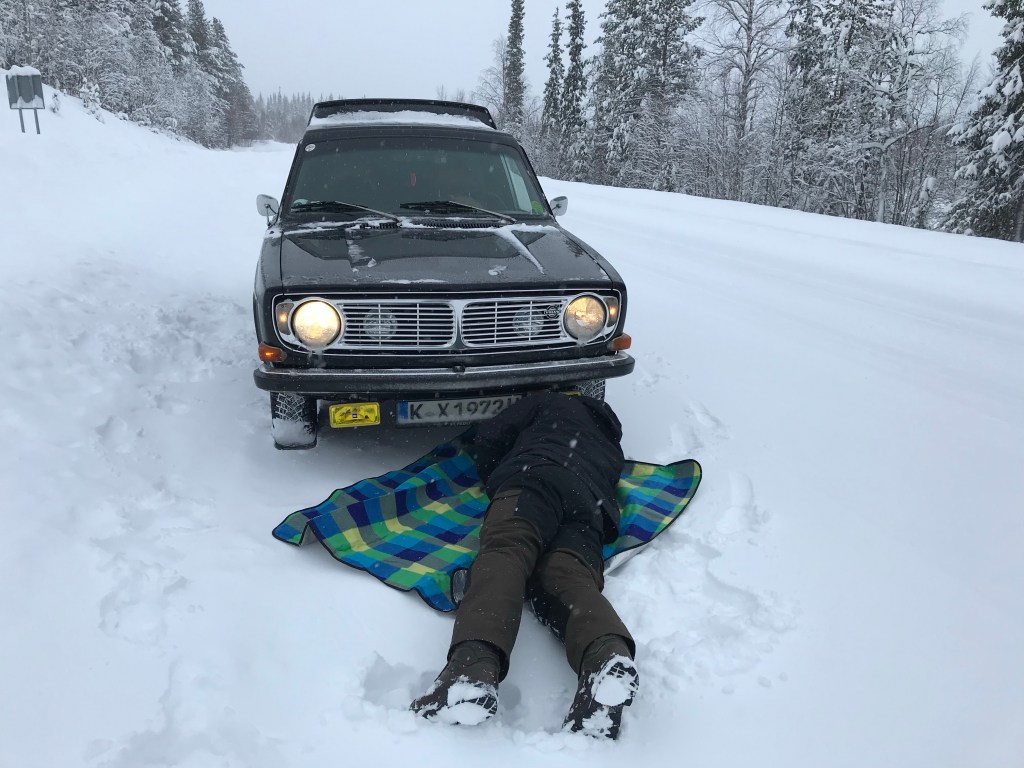 Als Route haben wir uns die E8 rausgesucht, wollen also schnell nach Finnland wechseln und dann auf der finnischen Seite des Grenzflusses nach Norden fahren. Der Fluss heißt auf dieser Strecke dreimal anders – nachdem wir gestern uns die Mühe gegeben habe, den Torne Älv und seinen Verlauf zu verstehen, versuchen wir es hier gar nicht erst. Nach Finnland kommen wir aber garnicht erst. Die Straße zum Grenzübergang ist schlicht und ergreifend komplett zugeschneit. Nicht nur so ein bisschen wie gestern die Zufahrten zur Ostsee, sondern so 1,5 Meter hoch zugeschneit. Offensichtlich hat man sich dazu entschieden, dass dieser Grenzübergang im Winter keine Rolle spielen soll. Zwei Möglichkeiten also: entweder wieder Richtung Süden und einen anderen Grenzübergang suchen, um die E8 fahren zu können oder Richtung Norden zur 99 zurück (die ja durch Pajala lief). Zurück nimmer, vorwärts immer. Also fahren wir über eine dieser kleinen schwedischen Nebenstraßen, irgendwo unter all dem Schnee und dem Eis wahrscheinlich eine richtig schlechte Schotterpiste. Denn das ist das, was oben ankommt. So viele Bodenwellen, Schlaglöcher, so viel Gerubbel, Geschepper und Geknarze hatten wir bisher noch nicht. Dafür fahren wir fast komplett alleine durch das schwedische Hinterland (was auch gut ist, diese Straße ist nämlich nur 1,5 Autos breit, abzüglich Schneewehen bleibt da nicht viel Platz bei Gegenverkehr) bis wir bei Aareavaara wieder auf die 99 stoßen. Auf dem Weg treffen wir noch auf vermutliche wilde (weil unmarkierte) Rentiere und haben einen Moment Zeit, um sie aus dem Auto heraus zu beobachten. Katrin ist total hin und weg. Die Oberfläche der 99 ist im Kern genauso wie die gerade eben gefahrene Nebenstraße, nur dass sie eigentlich ausreichend Platz für Gegenverkehr hat. Eigentlich, wären da nicht Schneewehen und hätten die Räumfahrzeuge nicht großzügig Raum zu den Streckenmarkierungen gelassen. Und jedes Lob über rücksichtsvollen Gegenverkehr von gestern (bei Nacht) müssen wir jetzt zurücknehmen. Hier wird geballert als wären 20 Grad, trockene Fahrbahn, beste Sicht und Sonnenschein. Wir fahren maximal 70 km/h, meist deutlich drunter. Wir haben den Volvo 145 Express zwar für Reisen auch jenseits deutscher Straßenverhältnisse aufgebaut, aber man muß ja nicht mit Gewalt den Schaden forcieren. Vor allem, weil wir uns Finnland nähern und Finnland bisher jedes, aber wirklich jedes Auto mit dem Matthias da war, versucht hat zu töten. Und als Menschen die so Quatsch mit Autos machen, sind wir bei sowas sehr abergläubisch.