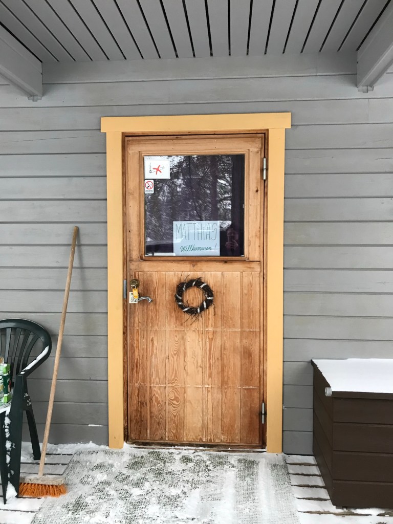 Also Anruf bei der Kontaktnummer. Auf die Frage, ob wir auf englisch kommunizieren könnten kommt die Antwort, deutsch wäre auch okay wenn wir langsam sprechen. Wir sollten doch einfach geradeaus bis zur Hütte 11 fahren. Dort wartet dann die Betreiberin des seit 1924 in Familienbesitz betriebenen Feriendorfes auf uns, ein supersüßes Schild „Matthias, willkommen“ hängt an der Tür. Leena erklärt uns kurz die Hütte und klärt mit uns alles Notwendige, danach sind wir in der 8-Bett-Hütte für uns. Und völlig geflasht. Zwar ist die Hütte und ihr Inventar sichtbar alt aber trotzdem ist alles hervorragend in Schuss. Und auf eine rustikale Art (das gute rustikal!) saugemütlich. Die Fußbodenheizung plus E-Heizungen haben schön vorgewärmt, das Auto kann direkt vor der Tür an eine Steckdose für Batterielader und Motorvorwärmer gehangen werden, für den Kamin liegt Feuerholz bereit, überall stehen Kerzen und Teelichter für die extra Portion Gemütlichkeit. Auf dem Tisch liegen umfangreiche Infos zur Gegend und zum Camp und möglichen Aktivitäten. Wir kommen hier an und fühlen uns willkommen und ein bisschen zu Hause. Wie gut, dass wir die Etappe heute kurz und extra einen halben DayOff eingeplant haben! Und wie schade, dass dieser Ort gute 2600 km von zu Hause entfernt ist. Hier könnte man wirklich öfter hinkommen. Wer in die Gegend kommt oder durchfährt sollte hier einen Stop einplanen, am besten für zwei, drei Tage.