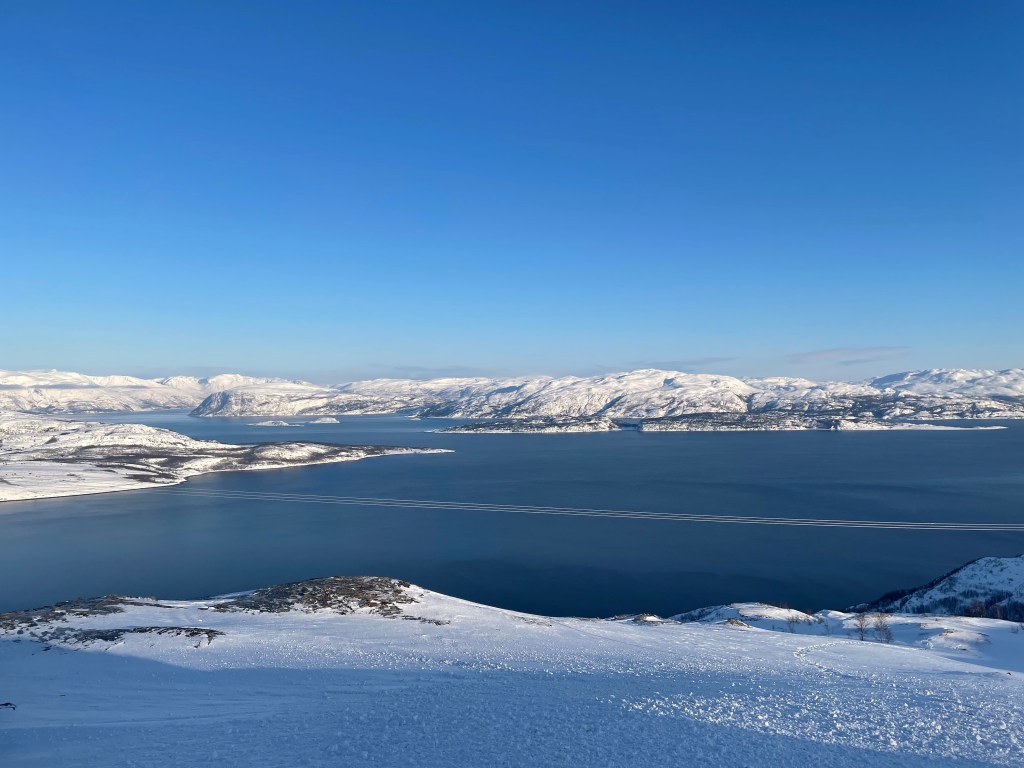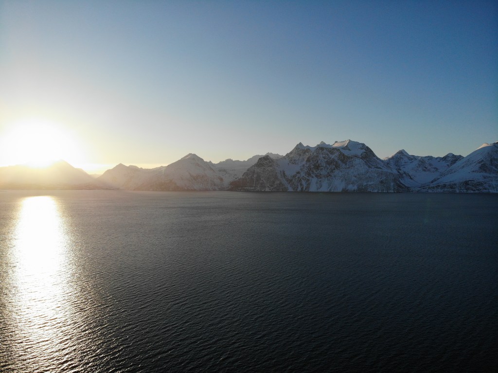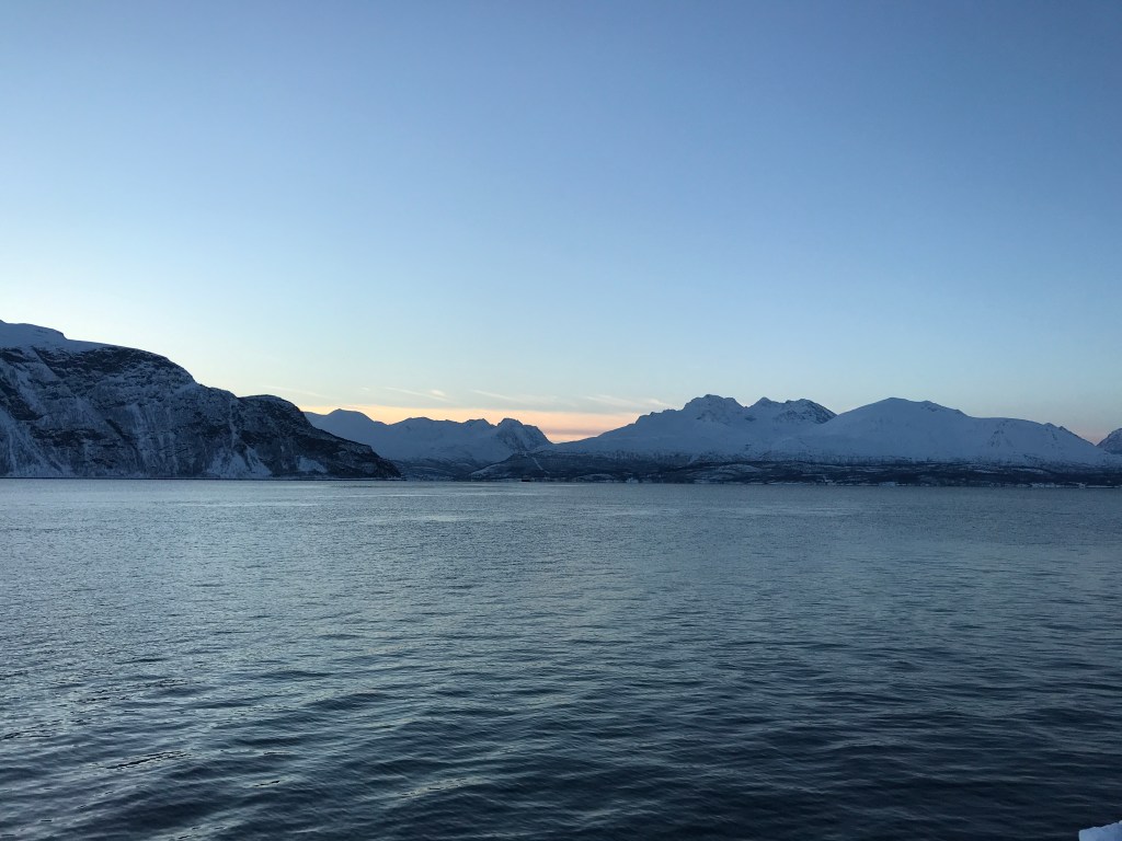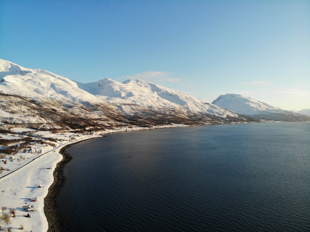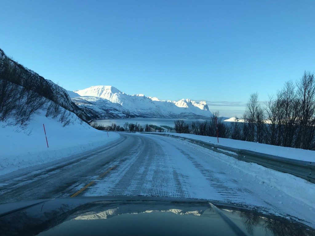 Wir fahren kontinuierlich die E6 entlang. Klingt ziemlich langweilig, ist es aber überhaupt nicht. Die E6 ist auf dieser Etappe eine wilde Mischung aus Küstenstraße direkt an und auf Höhe der Wasserlinie, Berg- und Passstraße durchsetzt mit Steigungen, scharfen Kurven und unendlich vielen Tunneln. Diese haben eine eigene Klimazone, bei Einfahrt deutlich unter -10 Grad Außentemperatur, in der Mitte der Tunnel teilweise Plusgrade bis 5 Grad und bei der Ausfahrt wieder deutlich unter -10 Grad. Dadurch bildet sich in den Tunneln Nebel, der die Sicht teilweise auf unter 50 m reduziert. Grund für uns vorsichtig durchzufahren, kein Grund für norwegische LKW vom Gas zu gehen. Es geht entlang des Langfjörden mit einem Fotostop mit Blick auf den Njulgeråssa (869m) und das Nevernesfjellet (ebenfalls 800+m) durch die Skanden Richtung Lyngenalpen. Norwegen zieht hier alle Register: gigantische, schneebedeckte Berge mit großen Gletschern, harte Abbruchkanten an denen Schmelzwasser zu großen Eisskulpturen gefroren ist, eine ständig wechselnde Straßenführung, ständig wechselnde Temperaturen mit Unterschieden (draußen) von bis zu 10 Grad, große Weite beim Blick auf und in die Fjorde, in denen viele Fischfarmen schwimmen. Es ist in seiner Einzelheit garnicht zu beschreiben, jede Kurve bringt heute einen neuen Eyecatcher.