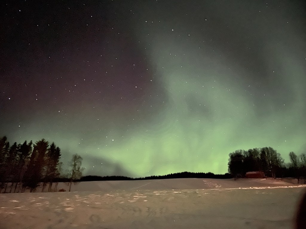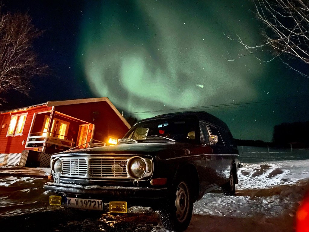 Im Dunklem kommen wir an unserer Unterkunft an, ein freistehendes Cottage auf einer (Ex-)Farm, betrieben von einem älteren Ehepaar. Wir checken ein und schnacken ein wenig und bekommen einen Sechser frische Eier vom Hofhuhn geschenkt. Die Hütte ist leider ziemlich ausgekühlt (knapp unter 11 Grad sind es drinnen), es dauert ein wenig und braucht intensiven E-Heizungs- und Bollerofeneinsatz bis sie erträglich warm ist. Wir tragen all unser Gepäck in die Hütte, es ist Halbzeit und wir müssen ein wenig umpacken und logistisch optimieren. Klassiker nach einer Handvoll Tagen im und aus dem Auto leben. Anschließend kochen wir uns Rouladen und wollen gerade die Beine hochlegen, als Katrin bei einem Blick aus dem Küchenfenster bemerkt, dass da vielleicht Polarlichter über uns sind. Also ziehen wir uns wieder an und stapfen raus in die Kälte. Und der Himmel zündet über uns richtig. Während die Polarlichter der letzten Tage „nur“ grün angehauchte Schleier waren, sehen wir jetzt kräftig grüne Vorhänge über den ganzen Himmel. Wir fummeln wieder am Handy rum und so langsam haben wir es raus, ganz passable Fotos zu machen. Und dann stehen wir einfach Arm in Arm da, ignorieren die vor Kälte fast tauben Füße und Finger und sind schwer ergriffen. Als wenn die Lyngenalpen kurz „Sorry, dass ihr selber so dumm wart und die Fähre verpasst und dadurch alles nur im Dunklen gesehen habt, hier ist was Fettes zum Trösten“ sagen wollen. Wir nehmen das Angebot dankend an. Diesen magischen Moment Himmelsfeuer haben wir für immer.
