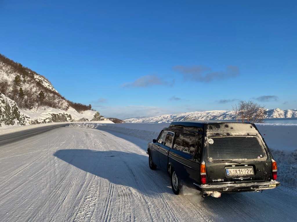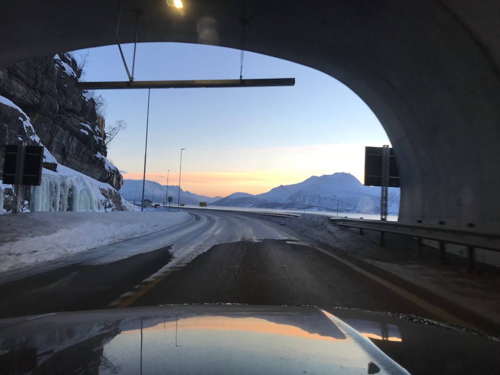 „Highlight“ ist dann noch, dass in einem der Tunnel auf der 868 die Luftfeuchtigkeit so hoch ist, das die Scheiben von außen beschlagen, wir die Wischer nutzen müssen, diese den gesamten Schmöck der letzten Tage einmal querschmieren und wir überhaupt nichts mehr sehen. In einem Tunnel, der anderthalb Fahrstreifen breit ist und so Ausweichbuchten hat. In einer dieser Buchten halten wir an, um mit Glasreiniger die Wischerblätter und die Scheibe zu reinigen und werden dabei von Norweger:innen überholt, die sich ganz deutlich nicht an die vorgeschriebenen 60 km/h halten. Man wächst ja mit den Herausforderungen vor die man gestellt wird und Scheiben putzen in einem Tunnel während mit deutlich über 100 km/h an einem in Armlänge vorbei geknallt wird, machen auf jeden Fall weiser. Zum Beispiel, dass auch zugefrorene Wischerblätter ab und an gereinigt werden müssen.