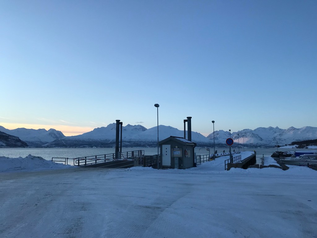 Bis hierhin ist uns unser Glück hold: bestes Wetter, kein Schneefall, blauer Himmel und Sonnenschein. Dazu phänomenale Landschaften und grandiose Ausblicke. Und während im Sommer die Aussichtspunkte und Park- und Rastplätze rappelvoll sind, haben wir jetzt jeden Spot im Prinzip alleine. Wir sind nur noch drei Minuten vom Fährableger in Olderdalen entfernt, als wir die Fähre auf dem Wasser sehen. Mit Fahrtrichtung Lyngseidet. Wir haben sie verpasst. Die nächste Fähre kommt in über anderthalb Stunden erst und legt dann auch erst wieder nach 15 Minuten ab. Die Chance, die großartige Fährfahrt durch diese Gebirgslandschaft zu machen, ist angesichts der Sonnenuntergangszeit damit hin. Wir überlegen ein bisschen hin und her und rechnen Routen durch und fassen den Entschluss, nicht auf die nächste Fähre zu warten, sondern der E6 bis Oteren zu folgen und dort auf die 868 abzubiegen und an der unteren Kante der Lyngenalpen den Fjord wieder hoch zu fahren. Im Sonnenuntergang kommen wir bis Oteren, danach fahren wir im Dunklen die 868. Was superärgerlich ist, denn das was wir an Ausblicken erahnen, sieht beeindruckend aus. Noch ärgerlicher ist, dass die gut 20 km 91 quer über die Halbinsel damit auch ihren Reiz verloren haben. Für Matthias waren diese 20 km aber eines der Highlights in dieser Region. Entsprechend niedrig ist das Laune-Niveau im Volvo. Hunger tut sein übriges, auch die gut 160 km mehr stecken uns mittlerweile in den Knochen. Das war so nicht geplant.