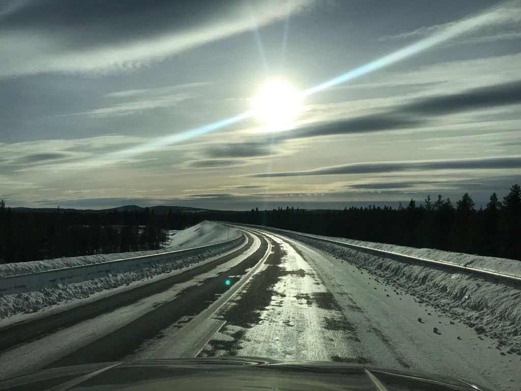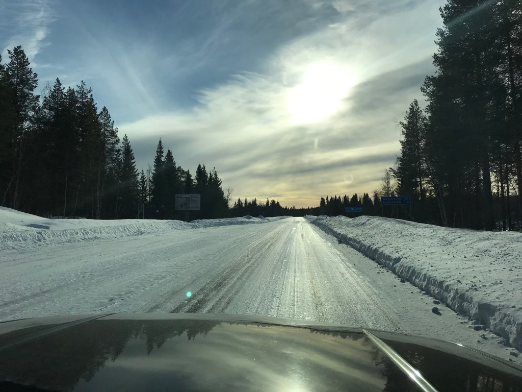 Wir haben gestern die Spikereifen gegen die Winterreifen gewechselt und auf der 95 kommen uns dazu Zweifel. Diese ist vollständig vereist. Wir entscheiden uns also für die E45-Route, da fahren wir seit längerem die letzten Tage eisfrei. Denn auf dem kurzen Stück 95 wird deutlich klar: die Spikes waren eine sehr gute Entscheidung. Zurück auf der E45 und gerade aus Arvidsjaur raus (wenigstens noch einen Erlkönig gesehen!) fühlen wir uns auf den Arm genommen: auch hier ist alles vereist. Vollständig. Und nicht nur ein bisschen. Fast zweieinhalb Stunden fahren wir über geschlossenes Eis. Ab und an guckt der Asphalt durch, aber eher selten und häufig auch arglistig täuschend. Die Temperaturen um null Grad der letzten Tage plus ausgiebiger Sonnenschein haben die Oberflächen des eher spröden und somit griffigen Straßeneises angetaut und nachts wieder schön einfrieren lassen. Jetzt haben wir Straßenbedingungen, über die sich die Duisburger Schlittschuhhalle sehr freuen würde. Dachten wir, dass wir die E45 durch immer gleichaussehende Landschaft eher gelangweilt abspulen würden, so haben wir uns jetzt unsere eigene Spannungskurve geschaffen.