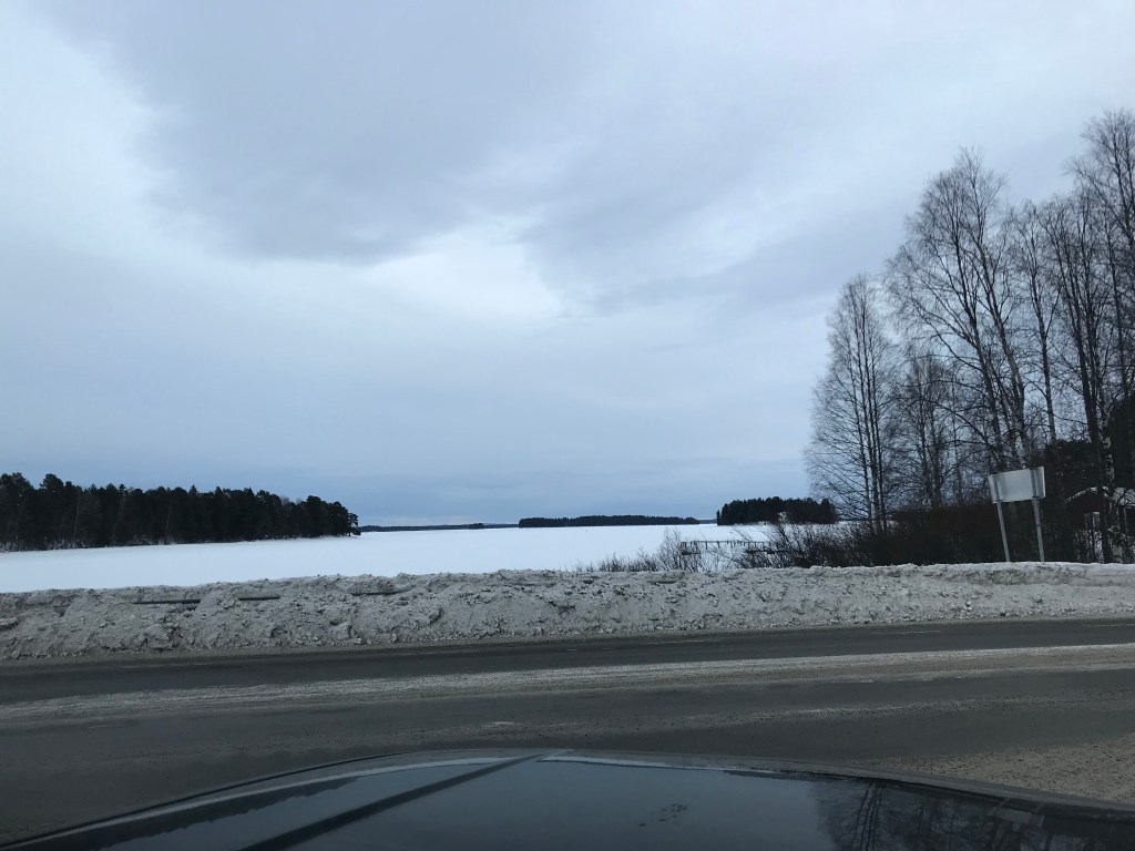 Ab Vilhelmina geht es langsam mit der Straße. Was ganz witzig ist, denn dort hatten Hinne und Matthias beim Winter BSC 2019 in die andere Richtung fahrend sich für die Spikereifen-Montage entschieden. Merken für die Zukunft: Vilhelmina ist ein guter Wechselort. Ab hier wird die Straße immer freier bis sie letztendlich bis auf innerstädtische Bereiche fast ganz schnee- und eisfrei ist (oder eben anders herum). Leider zeigt sich dadurch die Hässlichkeit des scheidenden Winters: siffige, mit einem Matsch aus Schnee und Streumittel (hier eine Mischung aus Sand und Splitt) bedeckte Fahrbahn und auch die Schneeberge und -wälle links und rechts der Straße sind von braun-grau-schwarzer Farbe. Keine Augenweide und da sich gleichzeitig die Sonne hinter Wolken versteckt und so alles in winterliches Grau hüllt, kommt so etwas wie elegische Stimmung auf. Die immergleiche Landschaft hinter den Scheiben tut ihr übriges: wir fahren gefühlt den ganzen Tag durch das gleiche Panorama aus schneefreien Bäumen neben schneebedecktem Boden, durchsetzt von ein paar Orten und dem einen oder anderen See. So richtig scheppert das hier alles nicht, im Sommer ist das bestimmt deutlich schöner. Im Sommer ist das hier nämlich ein einziges Schweden-Postkarten-Motiv. Aber so wie der Winter das Eindrucksvolle des Nordens verstärkt hat, so dämpft und egalisiert er hier die Landschaft.
