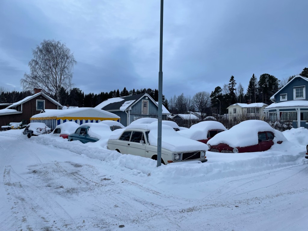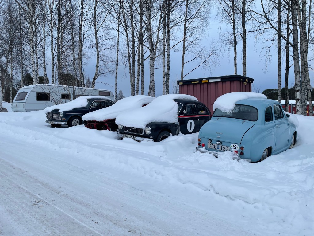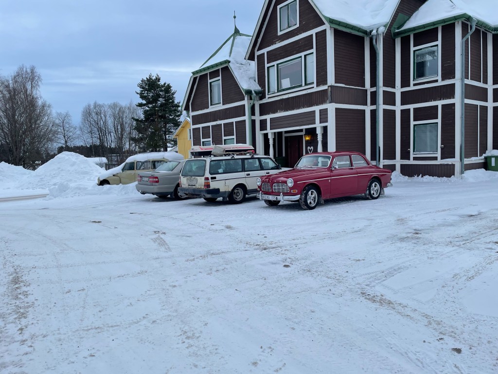 Was allerdings scheppert ist ein Zufallsfund. Wir tanken an einer der wenigen Tankstellen die 98 Oktan anbieten. Beim Ausfahren entdeckt Matthias etwas oberhalb der Tankstelle einen mit Schnee bedeckten Lloyd Alexander. Der muss fotografiert werden. Was erst beim Näher kommen zu sehen ist: hinter dem Lloyd steht ein Rallye-Buckelvolvo, daneben eine Amazon-Karosserie, daneben ebenfalls mit einer dicken Schneeschicht ein Amazon mit originalen Wolfrace-Felgen, in Deutschland werden nur die Felgen mit Gold aufgewogen. Und gegenüber stehen diverse weitere 140er, Amazonen, Buckel und Duetts. Am liebsten würde Matthias den Kofferraum voll machen – oder kurzer Hand einen Tieflader organisieren.