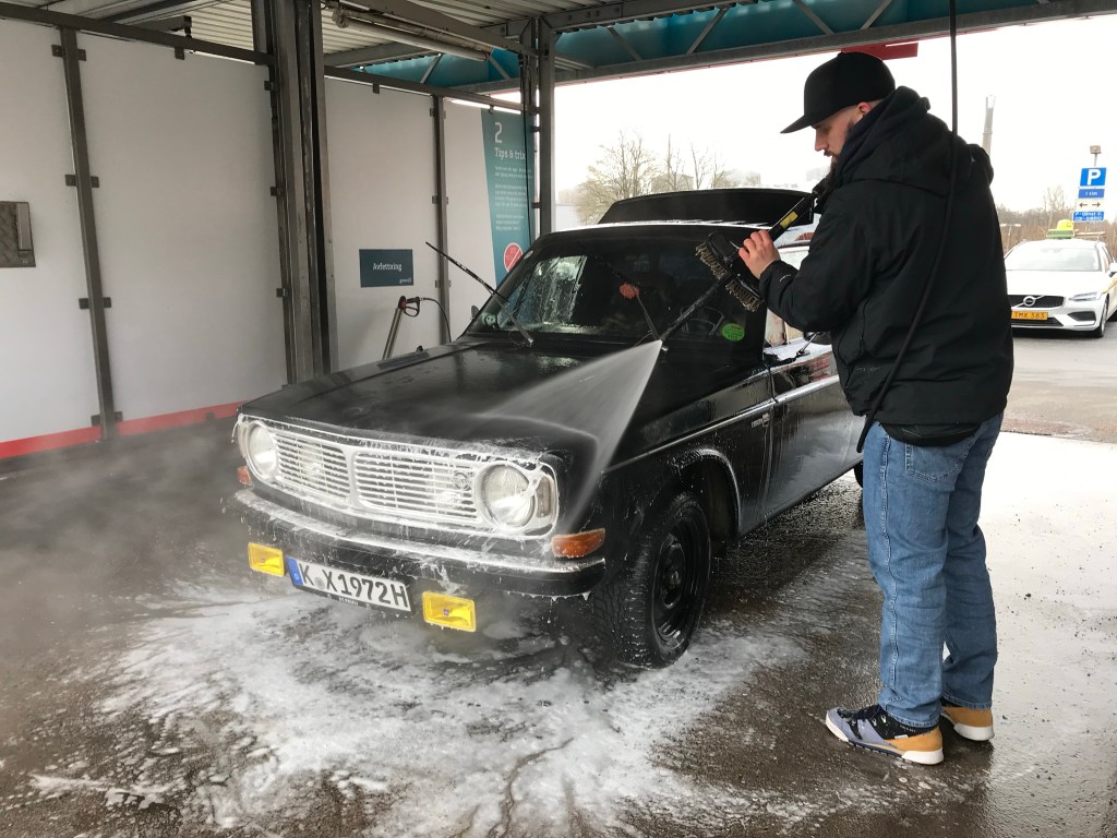Apropos Lackputzen: zwar hat Matthias gestern den Volvo einmal gekärchert, ein Geburtstag erfordert aber doch etwas mehr Wellness. Wir suchen uns einen SB-Waschplatz und hochdruckreinigen, shampoonieren und heißwachsen den Volvo ordentlich. Das Ergebnis ist den Umständen entsprechend okay, wir haben ja noch ein paar Kilometer gesalzene Straßen vor uns. Zu Hause gibt es dann die große Portion Liebe. Aber es reicht, um angemessen rausgeputzt zum 50. den Tag zu bestreiten. Außerdem regnet es das erste Mal auf der ganzen Tour.