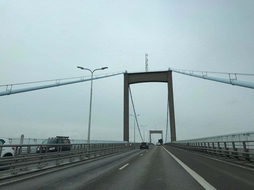 Wir fahren durch sehr weniger Verkehr als erwartet durch das Gewirr an Tunneln und Brücken, genießen dabei ein letztes Mal die einfach stur aus rohem Gestein ohne große Verschalung bestehenden Tunnel Richtung Volvo Museum. Dafür queren wir noch einmal die Älvsborgsbron und fahren von dieser direkt in das Hafengelände von Göteborg. Konkret haben wir uns keine Vorstellungen von der Umgebung gemacht, merken aber während wir durch die Industrielandschaft eines Verladehafens fahren, dass wir emotional ein bisschen mehr Romantik erwartet hatten. Ist natürlich rational Quatsch, aber ein bisschen cooler wäre es trotzdem gewesen, zu einem in postkartenmotivischer Landschaft gelegenen Sehnsuchtsort zu fahren.