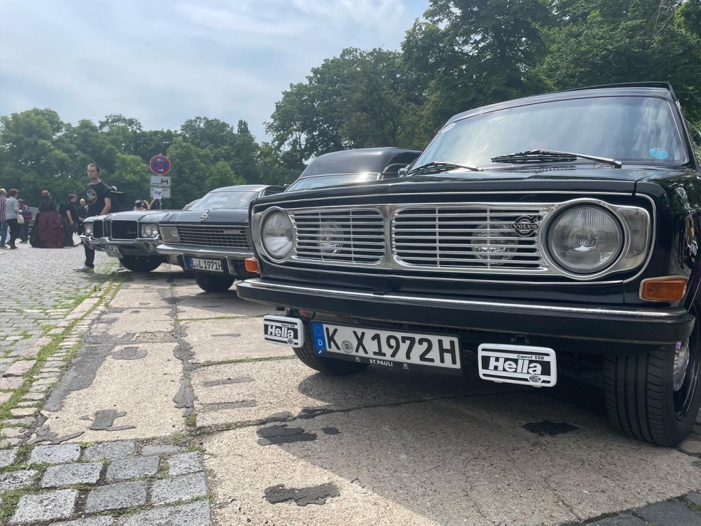 Dank tatkräftiger Unterstützung von Don und Stocken als Ordner (DANKE!!!) konnten wir alle 30 Fahrzeuge gut unterbringen. Von Jahr zu Jahr lernen wir ein bisschen mehr, können das Ganze etwas reibungsloser gestalten. Ein bisschen Chaos und Unordnung gehört beim Leichentreff am Südfriedhof aber auch dazu. Der Vormittag bis zur Abfahrt ist schnell erzählt: Abhängen mit lange nicht gesehenes Menschen, schnacken, erste Eindrücke sammeln. Das Publikumsinteresse war ungebrochen hoch, eine Menge Neugieriger drückte sich um und durch die Autos, viele WGT-typisch gut ausstaffiert. Oftmals wirkte es etwas unklar, wer mehr Aufmerksamkeit bekam, die Autos oder die gut (ver-?) gekleideten Menschen.