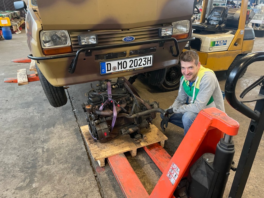 Mitte 2022 nahmen die Beiden das Projekt wieder auf, Foffi brauchte einen frischen TÜV um anschließend größere Umbauprojekte (sowas wie eine Höherlegung zum Beispiel) in Angriff nehmen zu können. In diesem Zuge nahm sich Andreas von der Wagenwerkstatt etwas Zeit und ging mit Matthias gemeinsam den Wagen systematisch durch. Dabei wurde leider ein riesengroßes ABER festgestellt: der Motor hatte auf Zylinder 2 und 4 kaum Kompression. Die weitere Diagnose offenbarte: Zylinder 2 krankt an defekten Ventilen, Zylinder 4 an defekten Kolbenringen. Mögliche Therapie: eine Generalüberholung. Oder alternativ der Wechsel des Triebwerkes. Da Möglichkeit 1 den finanziellen Rahmen sprengt starteten Micha und Matthias nach einer Motorsuche und dachten zwischenzeitlich sogar über den Kauf eines zweiten Fiestas als Spender nach. Rettung kam von Fiesta-Frank der noch einen Ersatzmotor auf Halde hatte. Der wurde irgendwann mal aus einem Unfallfahrzeug mit 68.000km ausgebaut und seitdem war er eingelagert. Und es ist ein 1,1-Liter-Motor mit 50PS, also eine Leistungssteigerung um 25%.