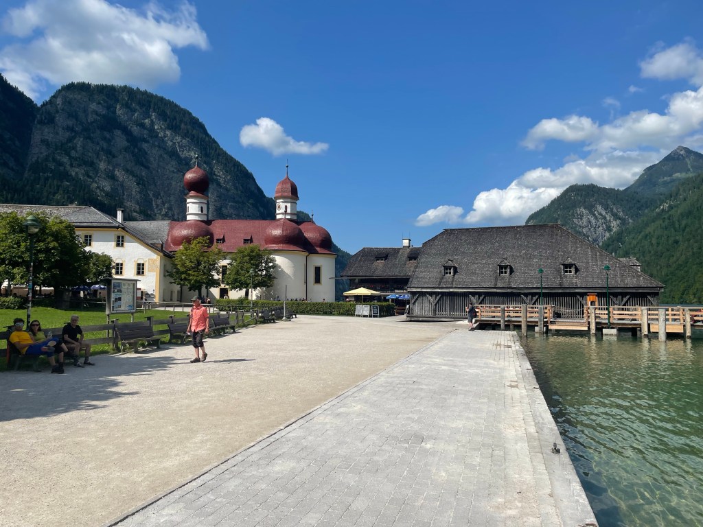 Fussläufig vom Campingplatz ist der Ort Schöngau am Königssee. Touristisch durch und durch, dafür aber akzeptable Preise. Zwei Portionen Wurstsalat und kaltes Bier sorgten für Ruhe an der Bauchfront, anschließend kauften wir Bayrischen Seenschifffahrt zwei Tickets Hin und Rück nach St. Bartholomä, einer 1697 erbauten Wallfahrtskirche. Seit 1906 verkehren Passagierboote zu diesem Wallfahrtsort, seit 1906 elektrisch. Die Kirche selber ist eher unspektakulär, liegt unterhalb der Ostwand des Watzmanns aber landschaftlich beeindruckend. Auf der Schifffahrt dorthin passiert man die Echowand, eine Felsformation mit glasklarem Echo, eindrucksvoll von der Bootscrew mit einem Trompetenspiel demonstriert.