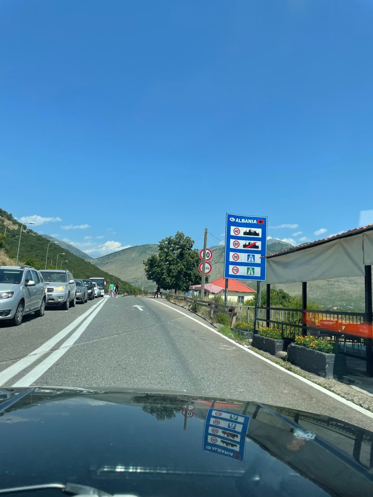 Hinter Bozaj wartet die montenegrinisch-albanische Grenze auf uns: See zur Rechten, Fels zur linken, dazwischen Asphalt und über allem die glühende Sonne. Wir haben – für das volle Erlebnis – unser Ankommen an der Grenze natürlich auf die Mittagszeit gelegt. Während wir warten, wird es 46° warm. Der Schweiß läuft uns runter, als würden wir in der Sauna sitzen. Nach 40 Minuten reisen wir aus Montenegro aus, sehr intensive Blicke in Ausweise und Fahrzeugpapiere und ins Auto ermöglichen das. Anschließend stehen wir wieder Schlange, eine Grenzhäuschen-Kooperation wie zwischen Bosnien-Herzegowina und Montenegro gibt es hier nicht. Erneut intensive Blicke in die Ausweisdokumente, diesmal müssen wir auch die Sonnenbrille absetzen, ebenfalls intensive Blicke in die Fahrzeugpapiere und nach über 1,5 Stunden haben wir diese fiktive Linie überschritten. Ein bisschen nachdenklich werden wir dabei schon: was für ein Segen, grundsätzlich erst einmal in einem politischen Zusammenhang zu leben, in dem Reisefreiheit relativ weiträumig möglich ist, was für ein Segen, einen Pass zu haben, der auch über Schengen hinaus superviel Bewegungsfreiheit bedeutet und was für ein Segen, die wirtschaftliche Freiheit zu haben, das auch nutzen zu können. Und erst Recht: Grenzen sind saunerviger Unfug.