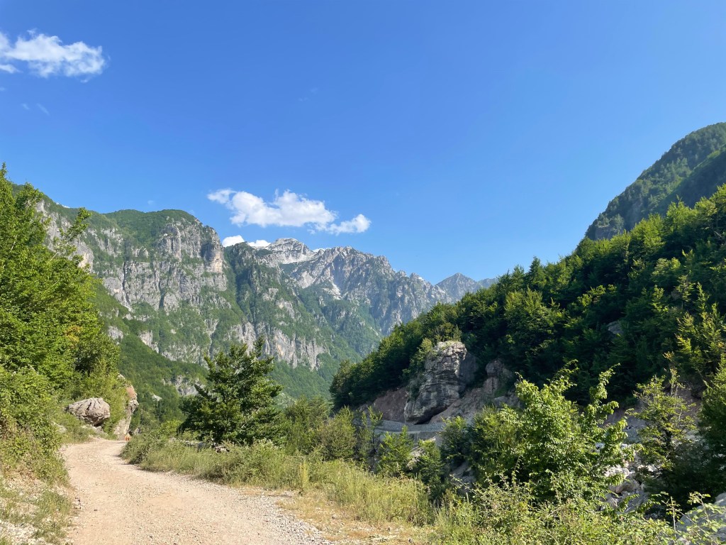 In Albanien folgen wir ab der Grenze der E762 ein kurzes Stück, Jeran biegen wir links auf eine unbezeichnete Strasse ab und befinden uns sofort in albanischen Verhältnissen: winzige Straße, tiefe Schlaglöcher (also so tief, das die Menschen vor Ort Bäume da rein stecken damit man nicht reinfährt/-fällt), Fahrbahnoberflächen zwischen nicht vorhanden und supergut innerhalb weniger hundert Meter und bis über die Straßendecke wachsende Vegetation. Wir kommen mit 30-40km/h voran, mehr ist (für uns) nicht drin. Über die SH21 fahren wir Richtung Norden, unser Ziel ist der Nationalpark unterhalb des fast 2700m hohen Jezerca. Um Boga ändert sich die Landschaft von weitläufig und hügelig zu felsiger Gebirgslandschaft mit dichtem Baumbestand. Es kühlt merklich ab, der Schatten der Bäume ist wohltuend.