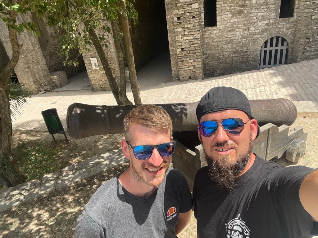 Unser Plan für die Stadt: kurz vor Mittag ankommen, parken, in die Altstadt gehen und das machen, was alte Männer hier ganz selbstverständlich zu dieser Tageszeit machen: im Café sitzen. Und weil wir nicht gefrühstückt hatten, noch was essen. Anschließend Burg und Stadt erkunden. Parkplatz ist erstaunlich schnell gefunden, der Weg in die engen Gassen auch, ein geeignetes Restaurant mit schattigen Außenbereich in dem bereits alte Männer sitzen und chillen ebenfalls. Wir bestellen Salat (es kommt so ein griechischer Salat), Quyfte und Omlett. Und diverse Getränke, wir bleiben gut zwei Stunden sitzen. anschließend besichtigen wir die Burg, besonderes „Highlight“ eine eindrucksvolle Sammlung diverser Kanonen aus unterschiedlichsten Epochen sowie einem ziemlich abgewracktem US-Airforce-Flugzeug. Im Ernst: die Burg hat zwei, drei nette Ausblicke, das war es aber auch. Für vier Euro kann man sich das geben, ist aber eher Quatsch.