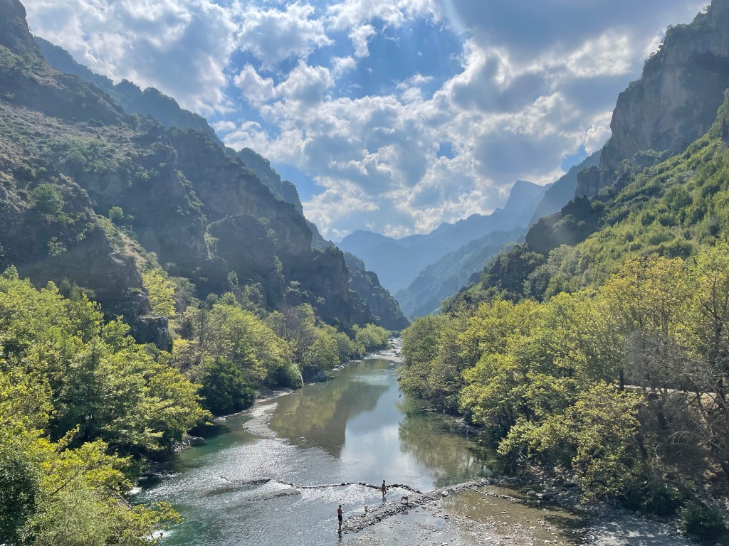 Bei Konitsa halte ich kurz um meiner Brückenliebe zu fröhnen. Nach der Bombastbrücke gestern heute Kontrastprogramm. Die 1870 gebaute Einzelbogenbrücke überspannt mit 20m Höhe und 35m Länge den Fluss Aoos, direkt neben ihr fällt ein kleiner Wasserfall in den Fluss. Dabei verjüngt sich der Brückenbogen zur Mitte hin so sehr, dass man kaum glaubt, dass diese Brücke tragfähig ist. Im Brückenbogen hängt eine Glocke, wird diese vom Wind geschlagen ist ein Überqueren der Brücke nicht sicher. 1881 wäre diese, derzeit und damals in Griechenland liegende Brücke beinahe ein Grenzübergang zwischen der Türkei und Griechenland geworden, der Berliner Kongress entschied sich dann aber doch gegen einen Grenzverlauf über den Fluss Aoos und für einen Verlauf entlang des Flusses Arachthos.
