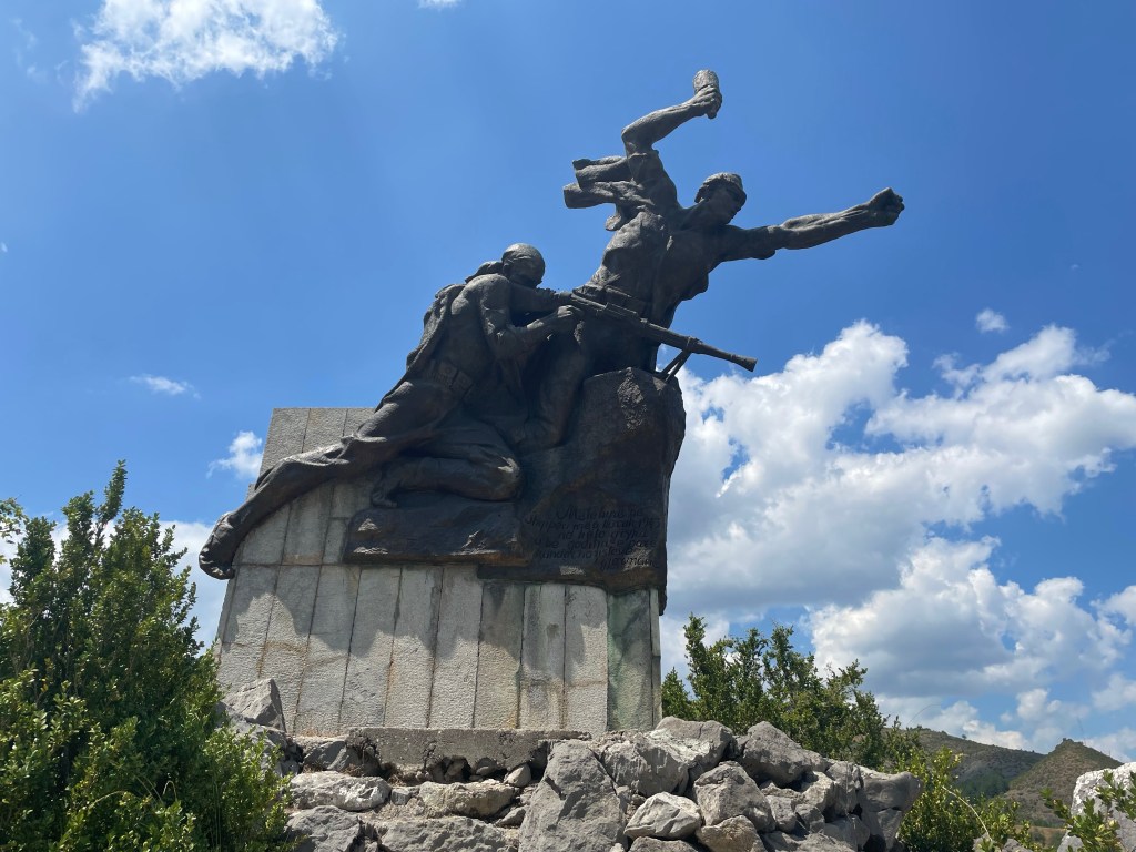 Ich kämpfe mich die Strasse entlang und bin immer wieder verwundert: das hier ist eine offizielle Hauptverkehrsstrasse. Verwundert ist darüber auch die EU, sie hat ein fettes Infrastrukturprojekt für diese Strasse losgetreten, überall wird (vielleicht nicht ganz sinnvoll) gebaut. Ich vermute, dass diese Straße in zwei, drei Jahren kein Abenteuer mehr sein wird. Entlang des Passes sind diverse Denkmäler für den Partisanenkampf und die Gefallenen des zweiten Weltkrieges. Ich halte an ihnen und verweile kurz. Die meisten stammen aus der Zeit der kommunistischen Diktatur, es ist ihnen deutlich anzumerken. Trotzdem scheinen sie besucht und rudimentär instand gehalten zu werden. Albanische Partisanen fügten der Wehrmacht massive Verluste auf ihrem Vorstoß auf Griechenland bei, bezahlten dies aber ebenfalls häufig mit ihrem Leben. Und, wie man Wehrmacht, SS und alles, was da dran hing, so kennt, haben diese auch vor massiven Gewaltverbrechen gegen die Zivilbevölkerung nicht halt gemacht. Insofern ist eine anhaltende Präsenz dieser Ereignisse und ein andauerndes Gedenken an die eigenen Kämpfer durchaus nachzuvollziehen.
