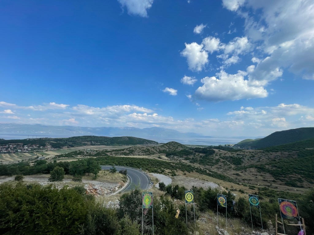 Ich lasse den Pass hinter mir und damit auch die Gravelroad. Die Straße wird geschmeidiger, ich kann mich zurücklehnen und drehe das Radio auf. Irgendwann öffnet sich vor mir der Ohridsee, einer der ältesten Seen der Erde. Der See gehört zum UNESCO-Welterbe. Sein Alter wird auf zwei bis fünf Millionen Jahre geschätzt, das Vorkommen besonderer endemischer Fisch- und Schneckenarten und das Ausbleiben anderer, sonst in der Gegend typischer Arten lassen auf eine Entstehung im Pleistozän (was auch ein Zeitraum von gut 2,5 Millionen Jahren ist) oder noch davor liegen.
