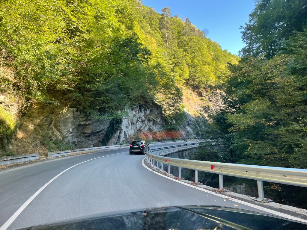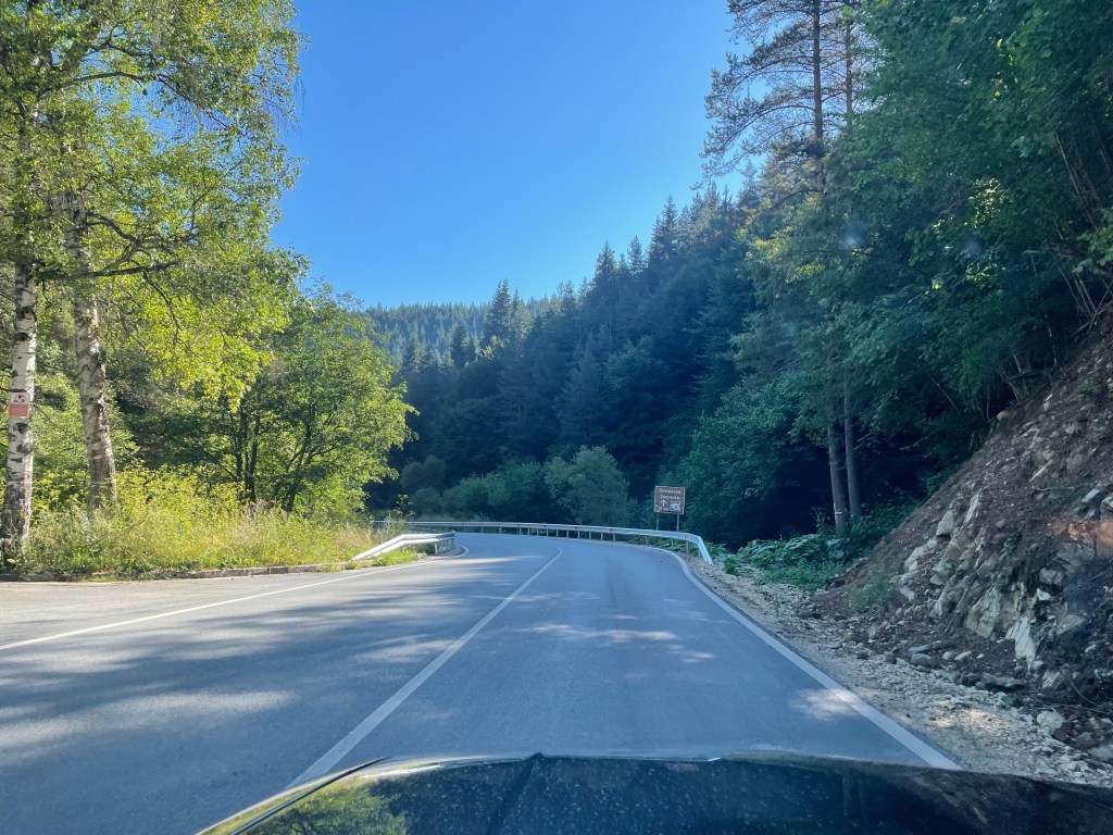 Bis Peschtera fahre ich durch dieses frühmorgendliche Waldidyll dann wechselt ich auf die 375 und erinner mich wieder, was ich an bulgarischen Landstrassen in den Ebenen so beeindruckend fand: das sind grade Linien in der Landschaft, man merkt richtig, wie sich die Planer*innen damals geweigert haben, in der Fläche Weg-Kontingent zu verschwenden. Wie mit dem Lineal gezogen reihen sich hier die Kilometer aneinander. Dabei sind sie fast immer von dichtem Busch- und Baumbestand umgeben, der auf die Fahrbahn wächst. Und so sehr man sich bei der Gradlinigkeit Mühe gegeben hat, so sehr hat man bei der Planhaftigkeit geschludert. Ordentlich verdichtet worden kann der Untergrund nicht sein. Die Strasse wankt von links nach rechts, hat Senken und Bodenwellen. Alles nicht schlimm wenn man wie ich mit 70-90km/h unterwegs ist (wir haben Nachts bei den anderen beiden Touren durch Bulgarien aber durchaus funkenschlagende Einheimische gesehen), es fährt und fühlt sich nur wie ein Schiff bei kabbeliger See an. Und wenn man lange genug auf diesen Straßen fährt, dann geht man nach dem Aussteigen auch wie ein Seemann. Also ich. Katrin würde wie eine Seefrau gehen. Aber so unter uns: unwitzig ist so eine Fahrbahnbeschaffenheit nicht.