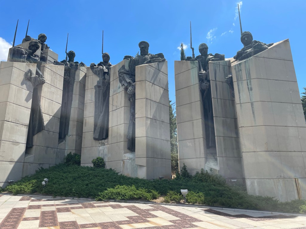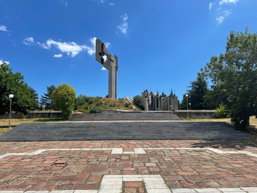 Ich fahre bis in die Stadt Stara Segora, dort fahre ich in den 1977 eröffneten Memorial Park mit seinen Denkmälern „Die Verteidiger von Stara Segora“ neben der „Flagge von Samara.“. Beides erinnert an das Jahr 1877 als der bulgarische Unabhängigkeitskrieg auf seinem Höhepunkt war. In der Nähe von Stara Segora widerstand eine Handvoll Opalchentsi (die bulgarische Freiwilligenarmee) der osmanischen Armee, sterben am Ende natürlich alle, die Stadt wird geschleift (aber später wieder aufgebaut), 14.500 Zivilist*innen getötet und natürlich ist das der Stoff für Heldenmärchen. So stehen diese Kämpfer sinnbildlich für Mut, Selbstlosigkeit und bedingungslose Aufopferung für das bulgarische Vaterland und seine Freiheit. Olé. Das man 100 Stufen (weil 100 Jahre später gebaut) zu den Helden empor steigen muss, wirkt da schon fast witzig.