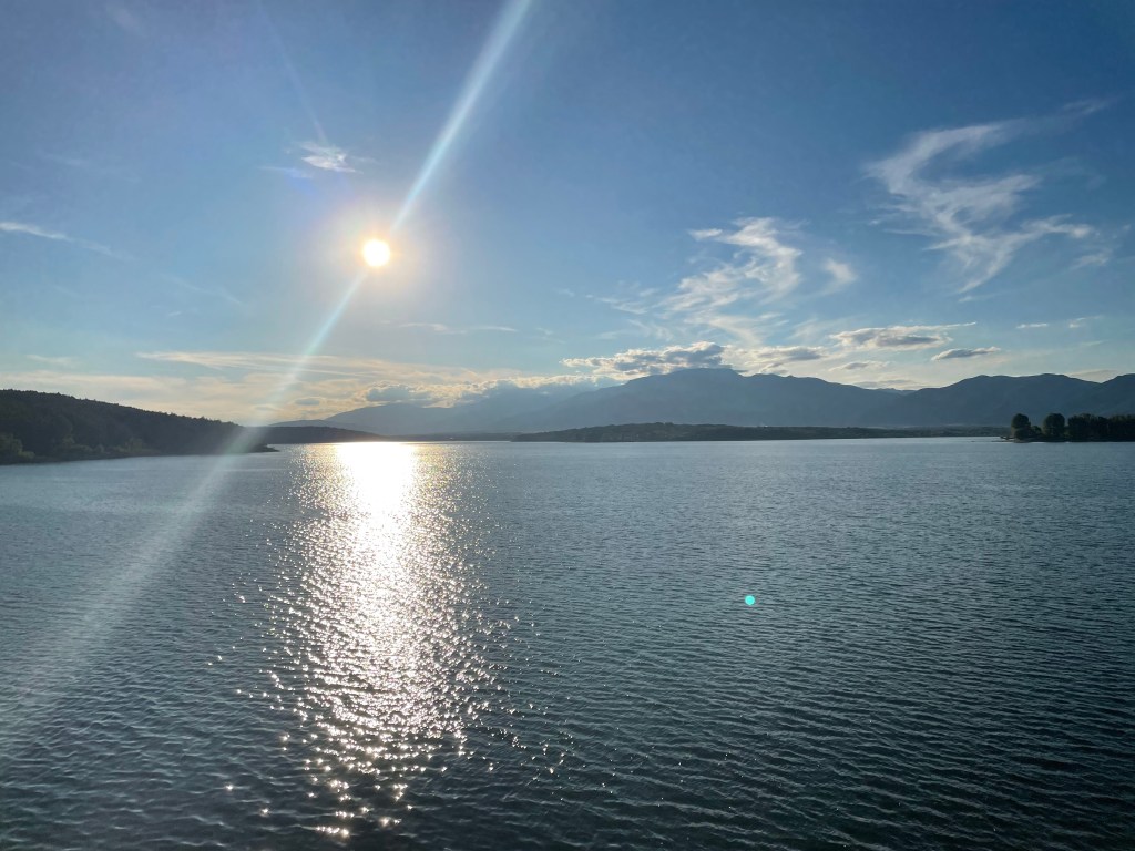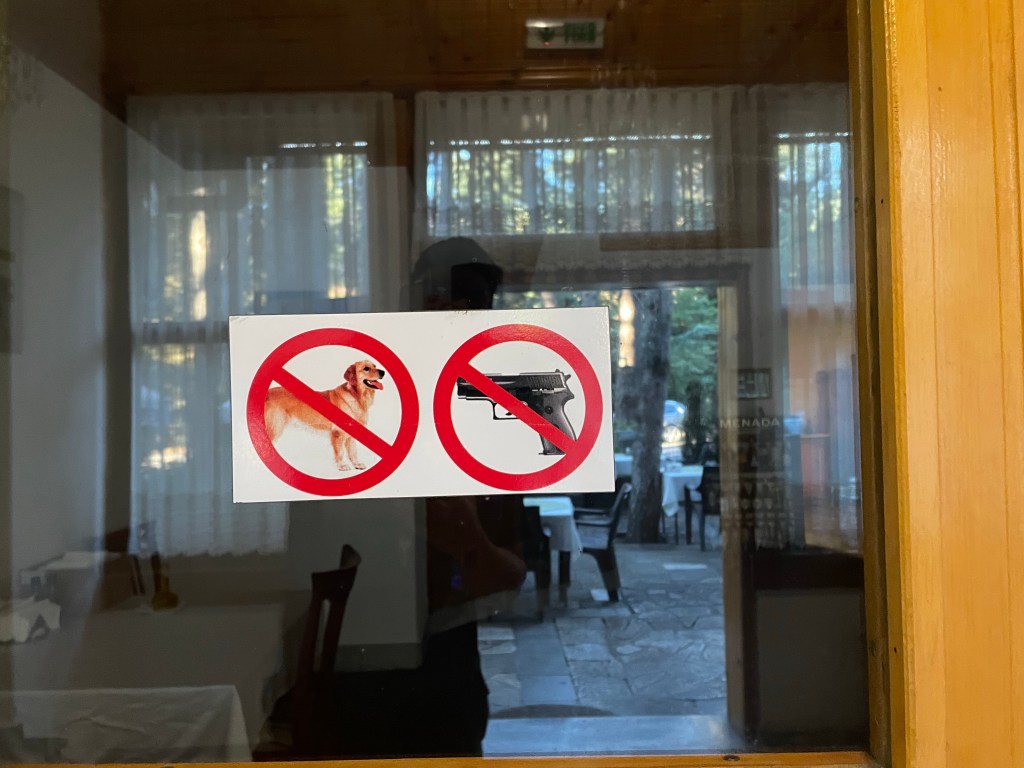 Das Restaurant hat gute Bewertungen, tatsächlich ist das Essen auch ganz okay. Mein Bauch freut sich über die erste feste Mahlzeit seit dem Frühstück in Krushevo, danach spaziere ich in der untergehenden Sonne bei milden Mitte 20° noch am Stausee entlang. Als ich auf mein Zimmer gehe fällt mir ein Verbotsschild auf. Mich lässt das ein wenig zweifeln, ob ich hier richtig bin. Lässt sich aber jetzt eh nicht mehr ändern, ich schließe meine Zimmertüre lieber richtig ab.