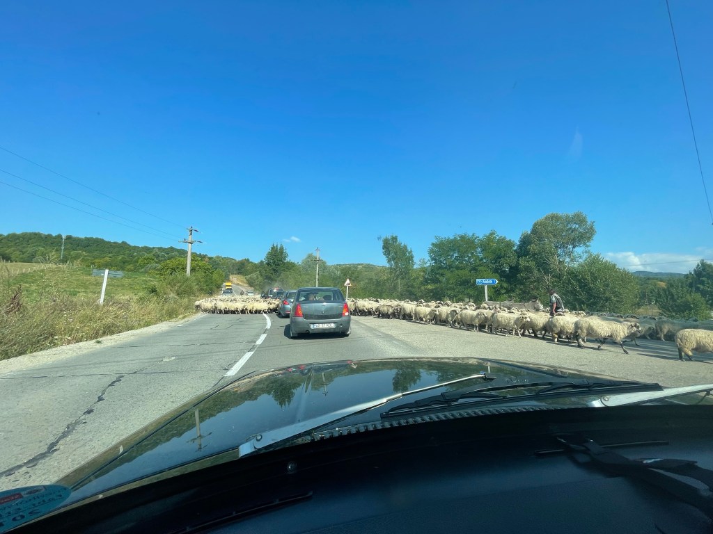 Soweit der Plan. Ich frühstücke Müsli, packe in Ruhe zusammen und springe nochmal unter die Dusche. Von Rucar aus fahre ich in südwestlicher Richtung, durchquere den Ort Campolung, verpasse wegen zu guter Musik meine Abfahrt und merke das erst gute 3km später. Also wenden, zurück und auf die 73C nach Westen abbiegen. Und da ist sie, diese geile rumänische Landstrasse. Bergig, von kleinen Dörfern gesäumt, verrückter Asphaltzustand zwischen gute Stücke, gute Stücke, bei denen schlecht verdichtet wurde und Schlaglochpiste. Das macht einfach Spaß zu fahren ohne das es richtig gefährlich werden kann. Ich hab richtig Bock auf diese Straßen, die Umgebung gibt ihr weiteres hinzu. Berge, egal in welche Richtung man guckt, alles sehr satt grün, dazu Wolken und Sonne und ein bisschen Wind. Ich mag das hier sehr. Kurz vor Domesti ist es mit dem Flow jedoch vorbei, ich stehe im Stau. Es macht den Eindruck wie gestern, ich recherchiere nebenbei, ob in Domesti irgendein touristisches Highlight ist, in das ich jetzt reinschepper. Immer mehr Autos stehen kreuz und quer am Strassenrand, Menschen laufen hin und her, alle sehen recht schick aus. Als ich auf den Ortskern zufahre, erkenne ich auch, was die Ursache ist: es ist Markt. Scheint von überregionaler Bedeutung zu sein, den Stau gibt es wieder, weil alle einfach halten, parken, losfahren wie sie wollen. Fast eine Stunde später habe ich den MArkt von Domesti und sein Chaos hinter mir. Ich trete aufs Gas – und schon wieder wird vor mir gebremst und wir stehen. Diesmal allerdingsfür eine kreuzende Schafsherde. Dank zweier Schäfer, diverser Esel und einiger Hütehunde geht das hier aber gesitteter und strukturierter über die Bühne als jeder Stau von gestern oder heute. Und mein Auto bekommt eine Wollpolitur.