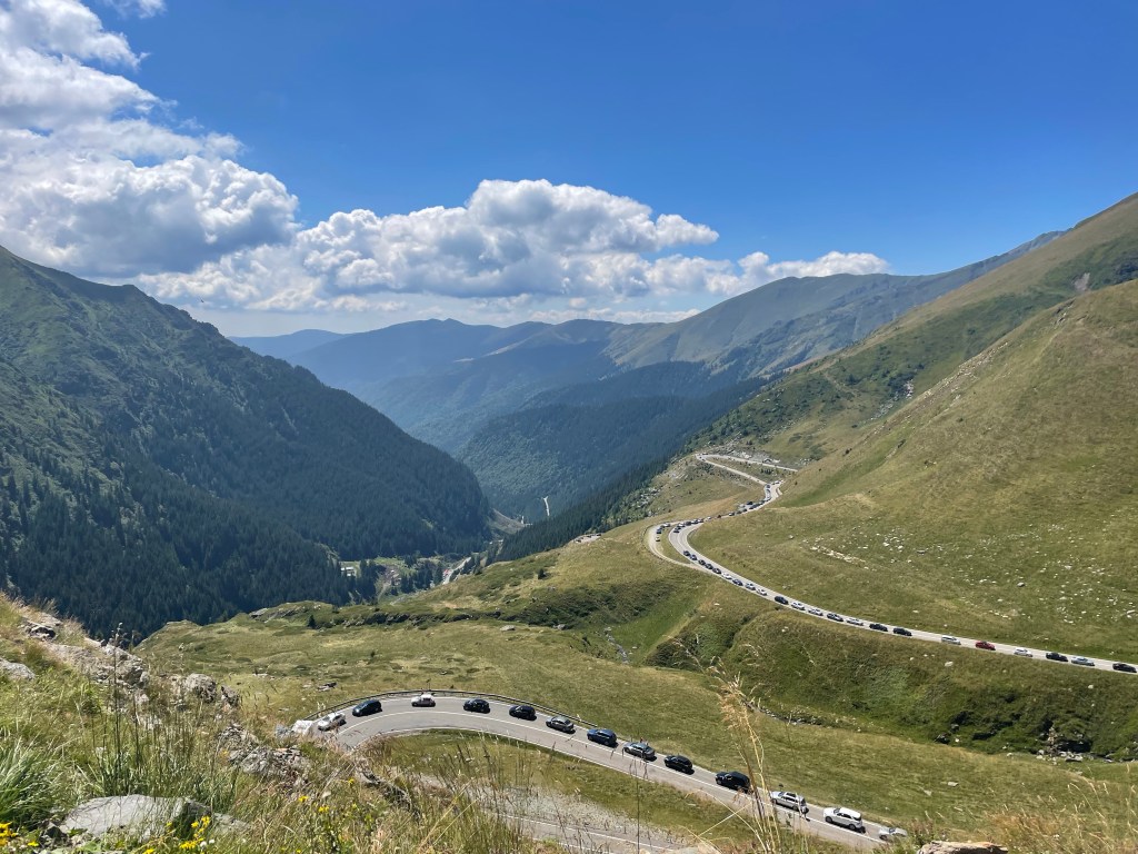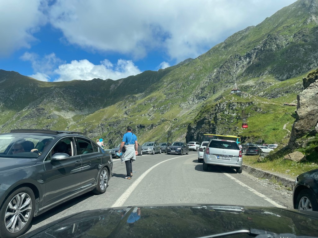 Ich habe mir – sicherheitshalber, eigentlich für den Fall, dass ich zu viel Auto Zeit auf der Hochstraße vertrödeln – ein Campingplatz zwischen beiden Straßen rausgesucht, diesen steuere ich an. Er liegt am Fuß der Transsilvanien Alpen (es wird nachts also wieder kalt), ich muss dafür am Ort Porumbacu de Jos in Richtung Süden auf eine kleine Straße durch den OrtPorumbacu de Sus fahren. Und als ich auf den Ort zu steuern, beiße ich in mein Lenkrad: ein verf***ter Stau. Ich bin auf einer Itsibitsi-Straße, die eine Sackgasse ist. Am Fuße der Berge. Ich will aus meinem Auto raus, ich will keine Bremslichter mehr vor mir sehen. Und doch stehe ich im Stau. In dem Ort ist Kirmes. Und alle müssen dahin. Oder waren da. Diesmal gibt es zwar ausgeschildert Parkplätze, die Kosten aber zehn Lei, die spart man sich doch gerne und packt – richtig – wild am nicht vorhandenen Straßenrand. Also auf der Straße. Auf der es dadurch nur noch schwieriger…… ist eigentlich auch egal.