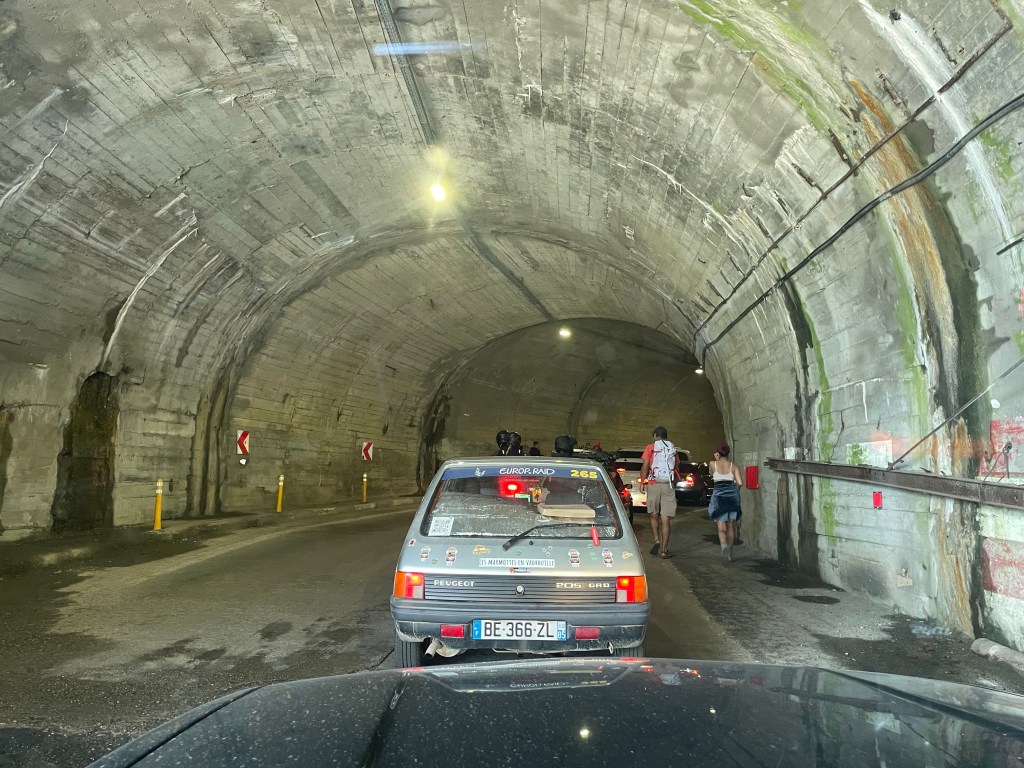 Die Passquerung ist ein Tunnel, etwas unter einem Kilometer lang. Dahinter war 2018 so ein touristisches Fress-Nepp-Abzugs-Stände-Ding. Drei, vier Stände, ein Restaurant. Durch den Tunnel geht der Stop-n-Go weiter, die Teilnehmenden einer französischen Peugeot-205-Rally (ich hab versucht heruaszubekommen, was die Rahmenbedingungen sind, niemand sprach englisch. Und die waren jünger als ich) kommen auf die Idee, dass dies der perfekte Moment für ihre Hupen, ihre Tröten und ihre wirklich „tolle“ Chanson-Musik ist. Ich resigniere. Und drehe meine Anlage voll auf. Keinen nerv mehr diesen Scheiss zu ertragen. Ich pumpe also mit 500 Watt Beginner durch das Auto, die Vibrationen meiner Motorhaube sagen mir, dass das auch die Franzos:innen mitbekommen müssen. Irgendwann machen die auch wieder ihre Türen zu und ich kann meine Musik auf ein erträgliches Level runterdrehen.