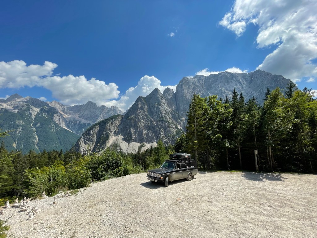 Die Abfahrt gehe ich ruhig an, sowieso oberstes Gebot wenn man mit dem 145 in den Bergen unterwegs ist. Zwar hat der Volvo bereits Scheibenbremsen rundum, allerdings sind diese nicht wie moderne Bremsscheiben innenbelüftet. Das bedeutet, dass sie zum Aufheizen neigen und das bringt zwei Gefahren mit sich: zum einen könnten die Bremsklötze verglasen und somit tendenziell keine Bremsleistung mehr haben, zum anderen, und das ist die deutlich schneller eintretende Gefahr, erhitzt sich zwangsläufig auch die Bremsflüssigkeit, dadurch können sich Dampfblasen bilden und damit hat man keinen ausreichenden Bremsdruck mehr. Beides führt auf jeden Fall dazu, dass man nur noch notfallmäßig die Handbremse reißen kann. Hatte ich einmal im Rahmen der Lost in the Alps Tour, fand ich sehr eindrucksvoll und brauche ich nicht wieder. Deswegen lege ich bei hohen Bergüberquerungen auf den Anstiegen immer eine Cool-Down-Pause ein, wenn möglich mit einem schönem Blick.