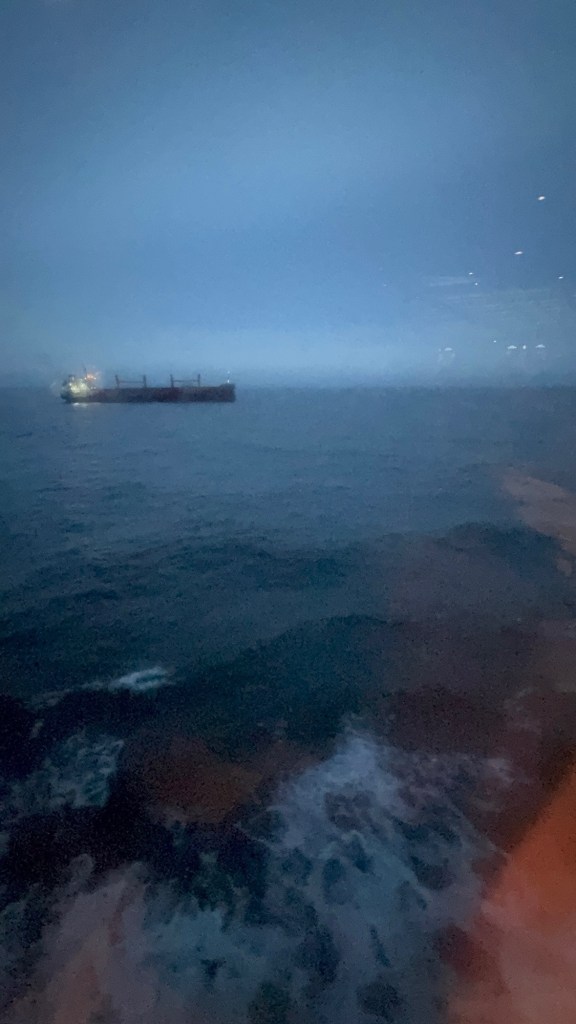 Mit noch kleinen Augen „springen“ wir nacheinander unter die Dusche, die nicht richtig ablaufen will und so das Bad komplett überschwemmt. Wir schaffen die obligate Körperhygenie bevor auch noch das Zimmer mit Teppich unter Wasser steht und machen uns auf zum Frühstück. Dort sind wir so früh, dass wir noch einen Platz am Fenster ergattern. Noch ist es draußen komplett schwarz. Das Abendessen konnte punkten, das Frühstück nicht so sehr. Erst recht nicht, als Katrin nach Informationen bezüglich einiger Inhaltsstoffe fragte. Obwohl überall steht, dass man für Informationen zu Allergenen das Personal fragen soll, führt dieses sich auf, als hätte Katrin verlangt, dass sie sofort die eigenen Eltern verkaufen sollen. Auch das Buffet lässt zu wünschen übrig. Matthias ist noch ausreichend satt vom Abendessen, Katrin hilft sich mit Obst und Gemüse. Wir lassen uns davon aber nicht stressen und essen ganz in Ruhe. Währenddessen schälen sich aus dem Schwarz erste erkennbare Abstufungen am Horizont heraus, später gesellen sich zart durch die Dämmerung schimmernde Schaumkronen von Wellen dazu, bis nach und nach ein Ausblick möglich ist. Über allem liegt ein grauer, nebliger Schleier der das Sonnenlicht nicht so richtig durchlässt. Trotzdem sehen wir bald auch erste Felsinseln, geankerte Schiffe und Leuchtfeuer – Göteborg ist nicht mehr sehr weit entfernt. Wir sind fertig mit dem Frühstück und gehen an Deck, um den Tag dort zu begrüßen und die Hafeneinfahrt an der frischen Luft zu verfolgen.