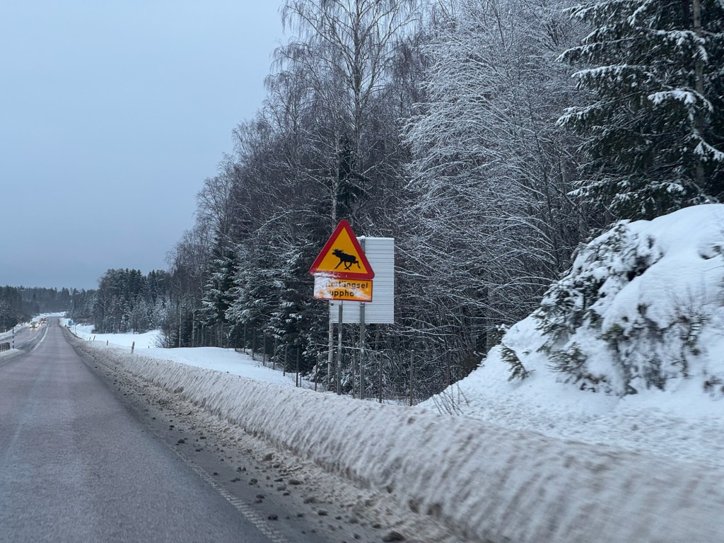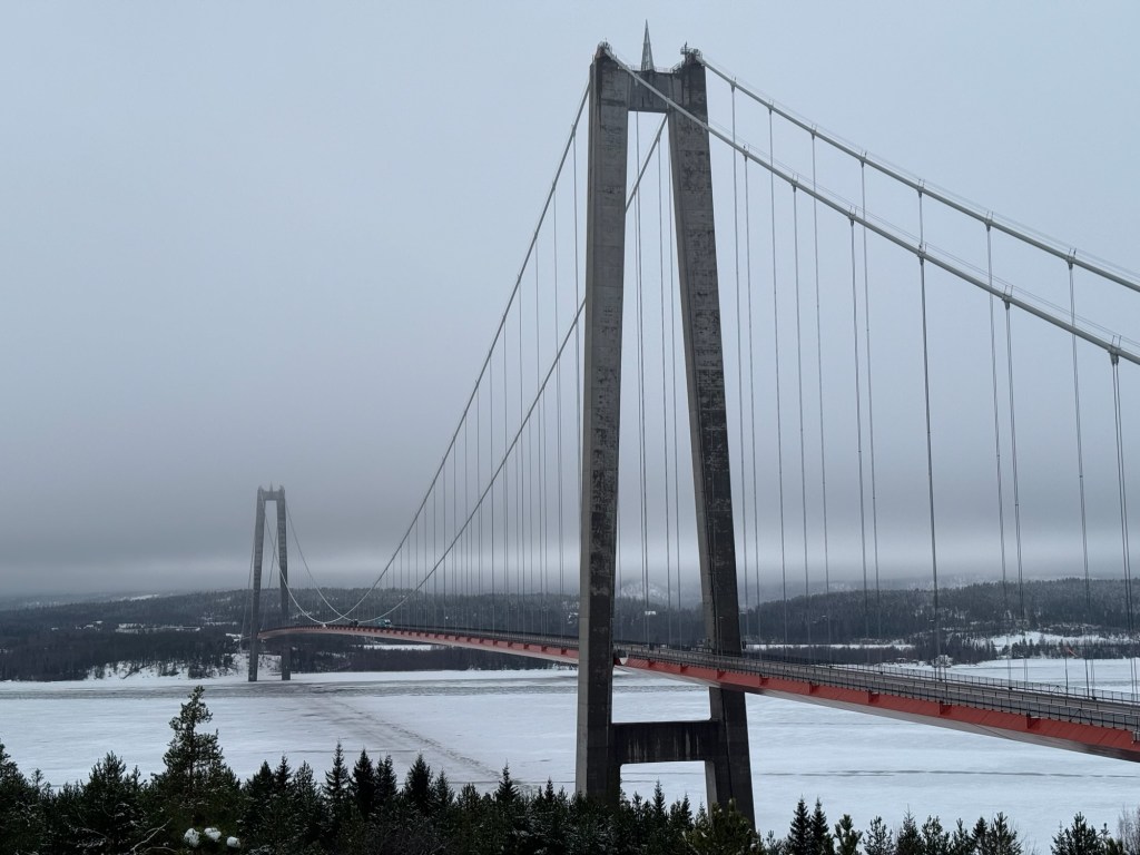 Einen geplanten Stop legen wir an der Hoga Kustenbron ein. 2022 hatten wir das zweitgrößte Bauwerk Schwedens überhaupt nicht auf dem Schirm. Jetzt halten wir vorher auf einem kleinem Parkplatz, um für Fotos eine saubere Frontscheibe zu haben, und hinter der Brücke am Hoga Kustenbron Hotel, einem etwas oberhalb der Brücke gelegenen Hotel mit Aussichtspunkt. Mit ihrer Stützweite von 1210m ist die Brücke in etwa so groß wie die Golden Gate Bridge, insgesamt ist die Brücke ein pragmatisches und trotzdem elegantes Bauwerk. Die Überfahrt über den vierspurigen Brückenträger aus Stahl und Beton in einer Höhe von 40 Metern über den Ångermanälven geht flott, die Aussischt auf die zugefrorene Flussmündung und die Schären dahinter hat es aber in sich. Wie so häufig bei der Überfahrt von Brücken in kleinen Autos ist das fotografisch kaum festzuhalten. Während in Live die Absperrungen am Fahrbahnrand verschwimmen und fast unsichtbar werden, sind sie auf Fotos immer zu sehen.