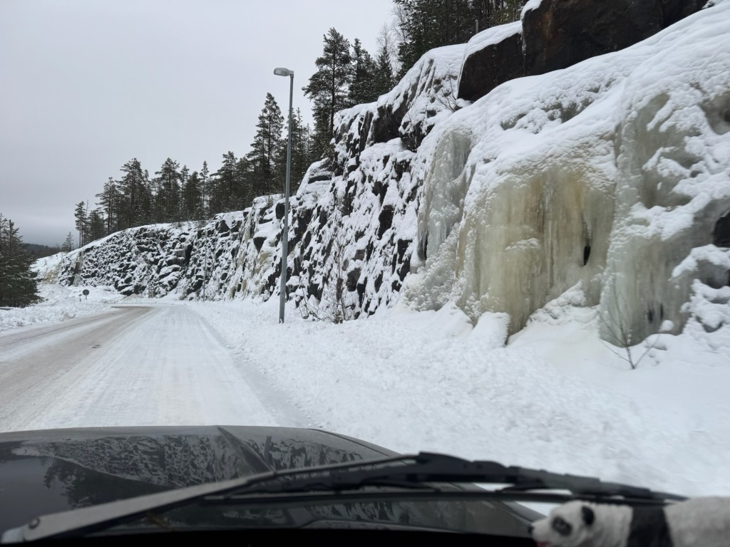 Heute ist so ein Transittag. Strecke machen, wenig oder keine Highlights und auch nicht die landschaftlich wertvolle Route nehmen. Diese Tage nerven, aber gehören leider auch dazu. Der Nervfaktor wird vom Wetter unterstrichen: Es ist grau, diesig, die ganze Zeit hängt Feuchtigkeit in der Luft. Die E4 ist gut geräumt, links und rechts türmt sich allerdings immer mehr Schnee. Da dieser wegen der durchgängigen Plusgrade die ganze Zeit schmilzt, ist die Straße matschig und mit einem Schmierfilm überzogen. Konsequenterweise natürlich auch unser Volvo.