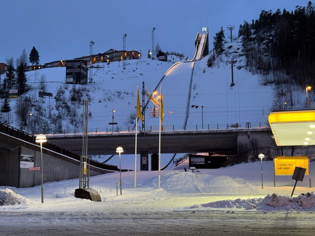 Bisschen spannend ist die Skisprungschanze ja. Klassisch an einem Berg gelegen, führt über ihre Auslaufzone eine Bahnstrecke. Nichts für schwache Nerven, denken wir und schauen nach. Diese Skischanze gehört zu einem ganzen Schanzenpark. Örnsköldsvig hat ein Skisprung-Gymnasium, ein Leistungszentrum und fast alle erfolgreichen Skispringer:innen haben hier trainiert.