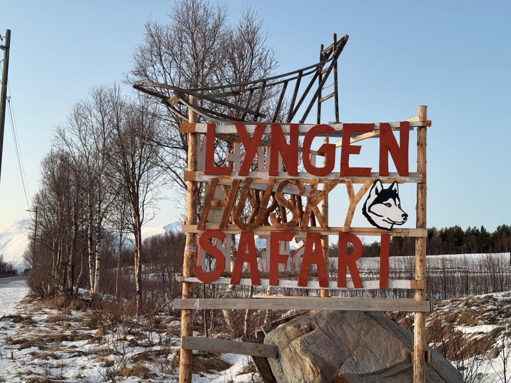 Kurz vor 12 machen wir uns dick eingepackt auf den Weg. Der Wind ist immer noch enorm, im frei liegenden Gesicht fühlt es sich wie kleine Nadelstiche an, so kalt ist es. Über allem scheint die Sonne in den tiefen Fjord. Wir rutschen vorsichtig unsere komplett überfrorene Einfahrt herunter (später erfahren wir, dass alles mit einem Eispanzer überzogen ist, weil es bei leichten Plusgraden letzte Woche geregnet hat. Regen plus Bodenfrost macht halt dicke Eispanzer) und fahren auf die 91 in Richtung Norden. Gute fünf Minuten lang, dann biegen wir links ab zum Gelände von Lyngen Safari.